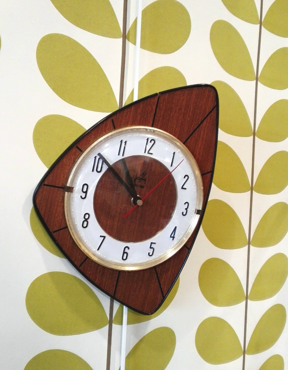 Horloge Japy électrique fonctionne avec une pile LR6 de 1,5 V. décor en formica et plastique.