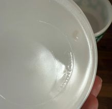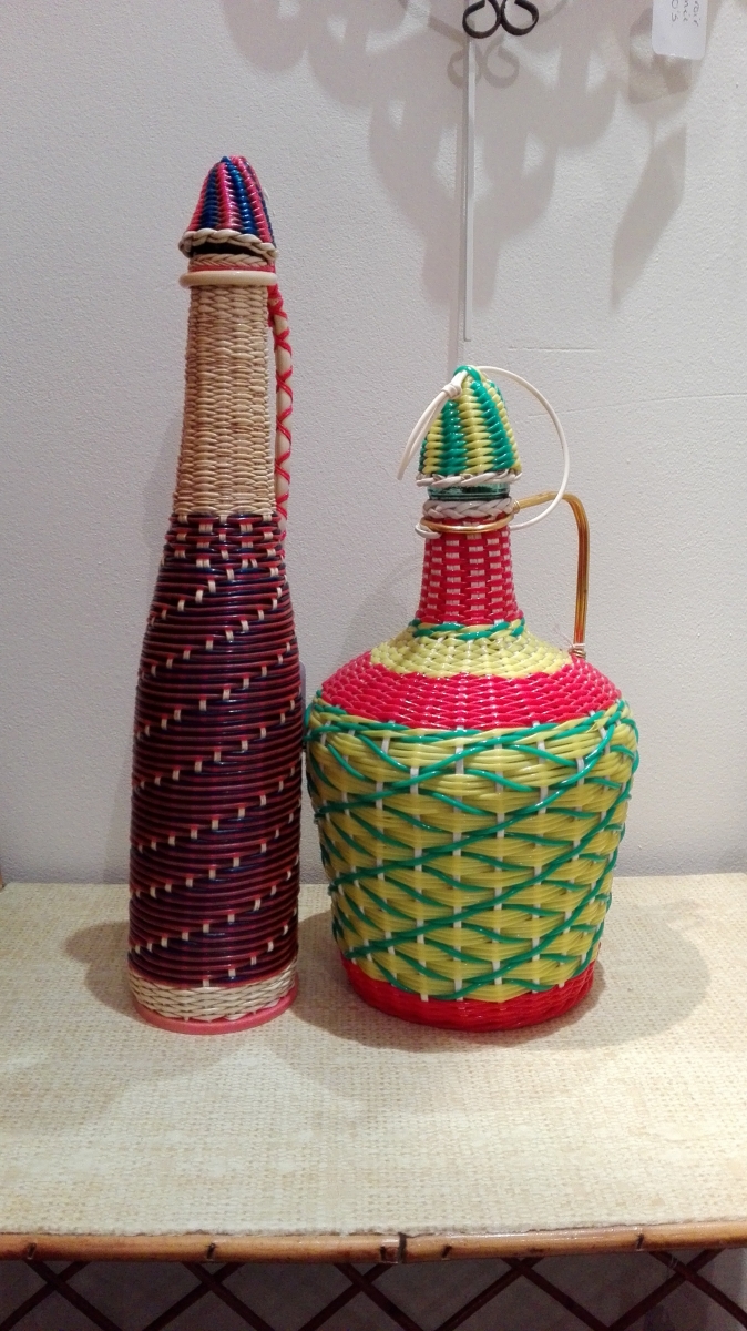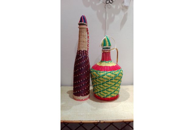 Lot de 2 carafes au décor "scoubidou" des années '60. Peut être vendu séparément 30 € pièce.
