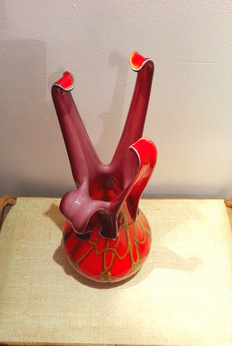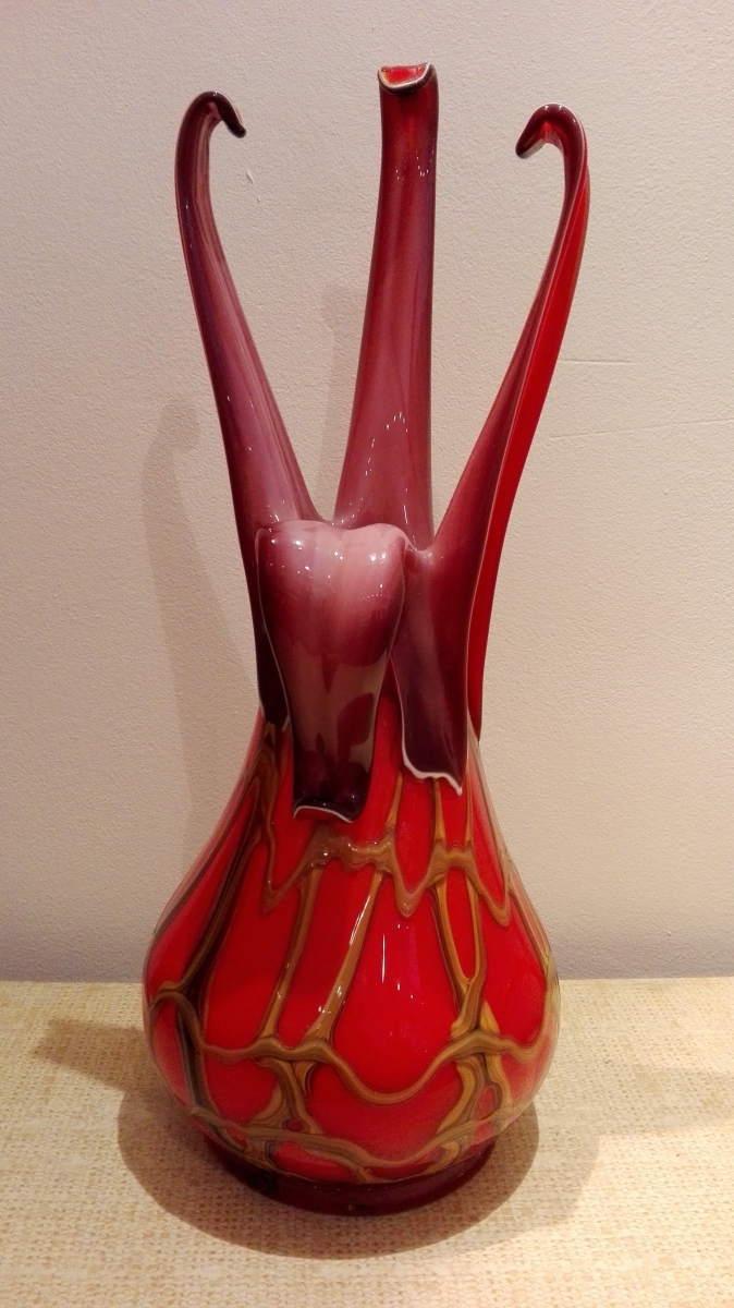 Vase en verre soufflé des années '60 - '70 fait main décor rouge orange et jaune moutarde. hauteur 45 cm.
