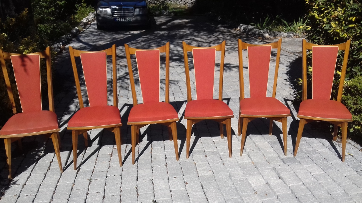6 chaises vintages des années 60 dans leur jus. Structure en bois vernis et assise en sky orange grainé avec liseret blanc. hauteur de l'assise 46 cm, hauteur totale 99 cm par 43 x 40.
