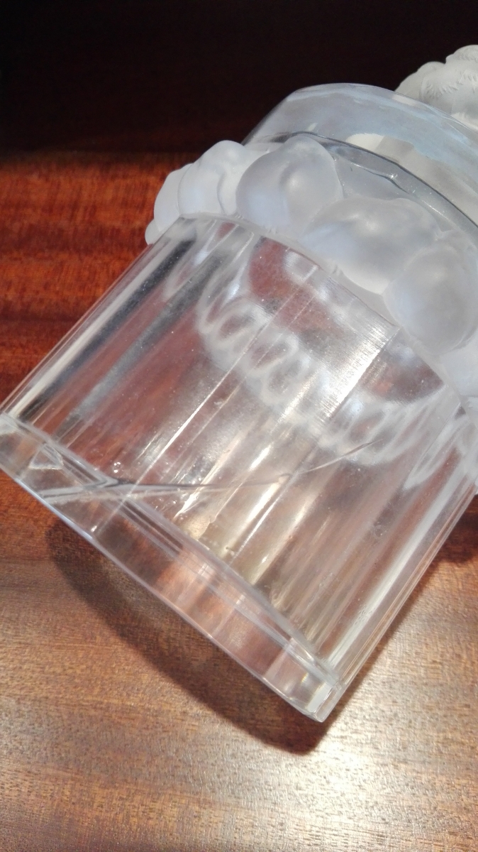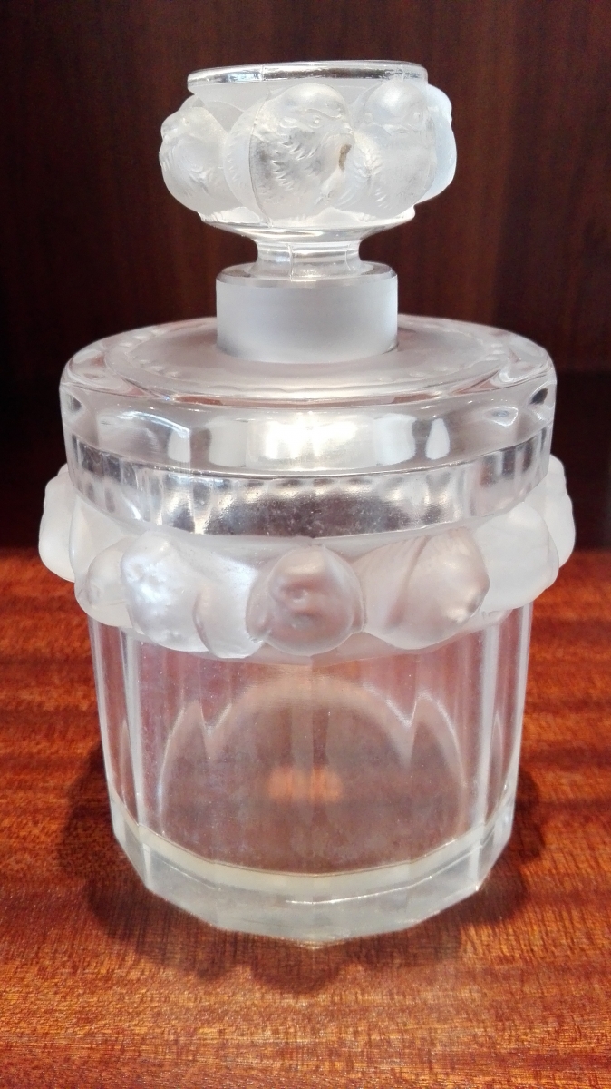 Flacon à parfum estampillé Lalique collection "Robinson" motif têtes d'oiseaux. fendu mais ne fuit pas, peut être utilisé. Objet rare et "collector" Diamètre 8 cm hauteur 13 cm.