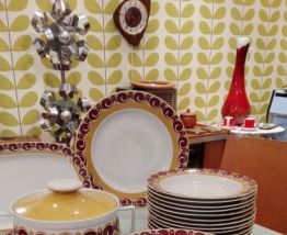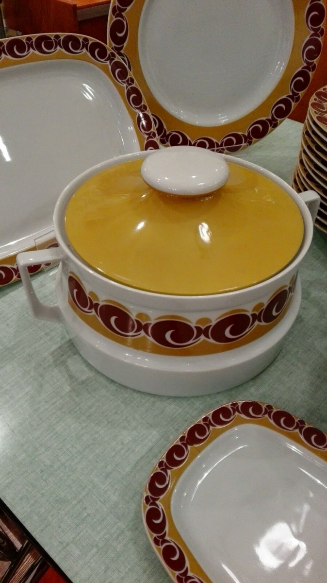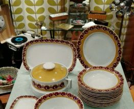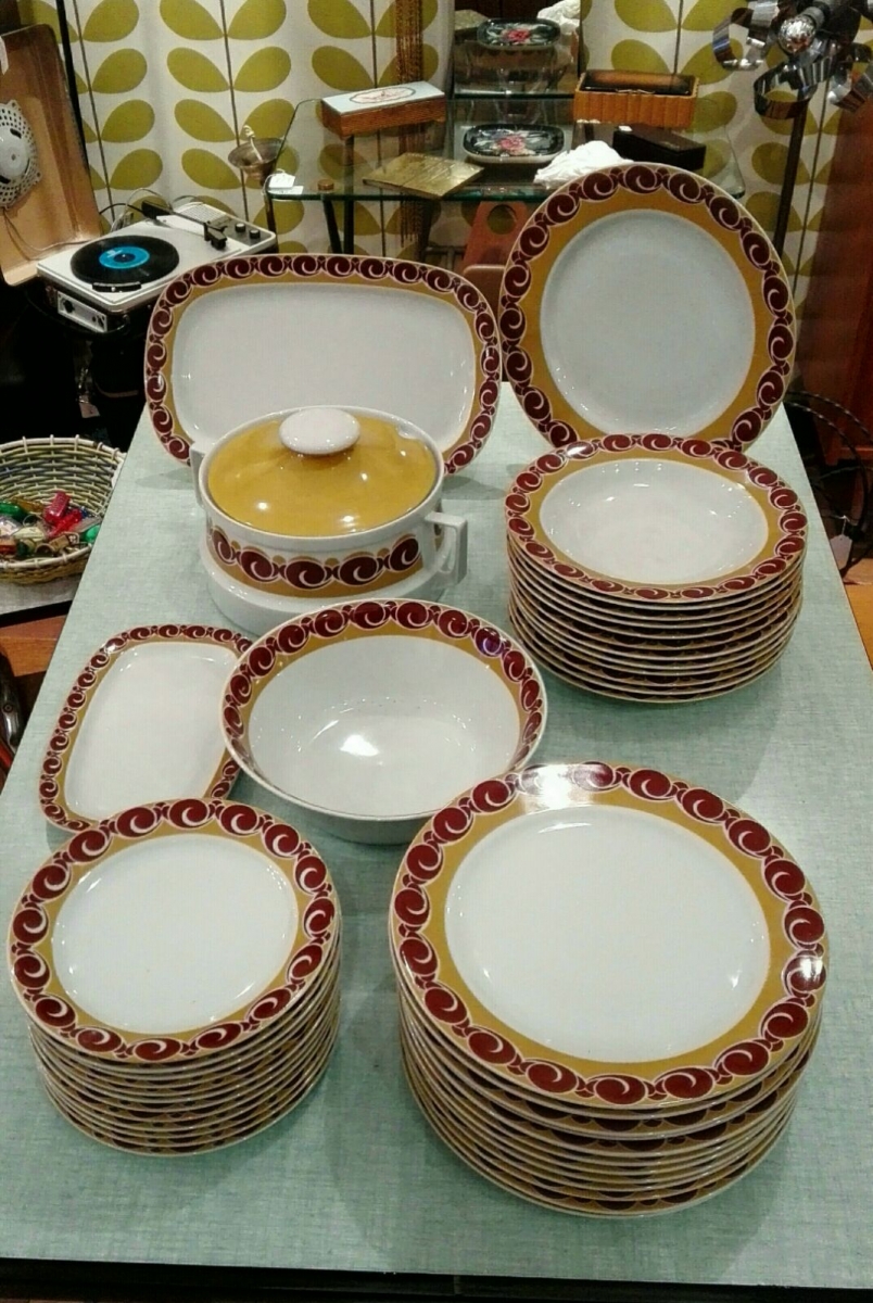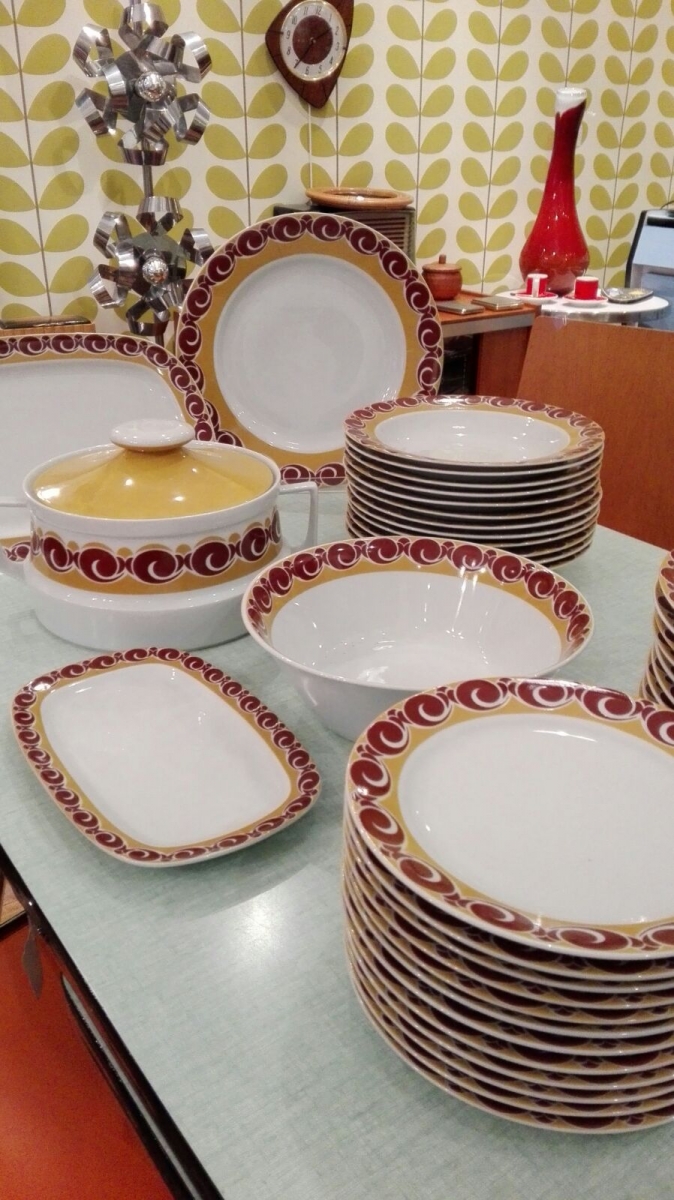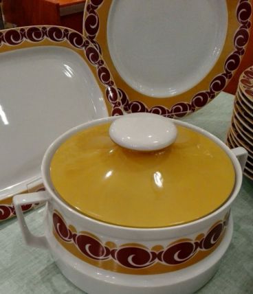 Très belle vaisselle des années '70 pour 12 couverts. Motif original ocre et marron.