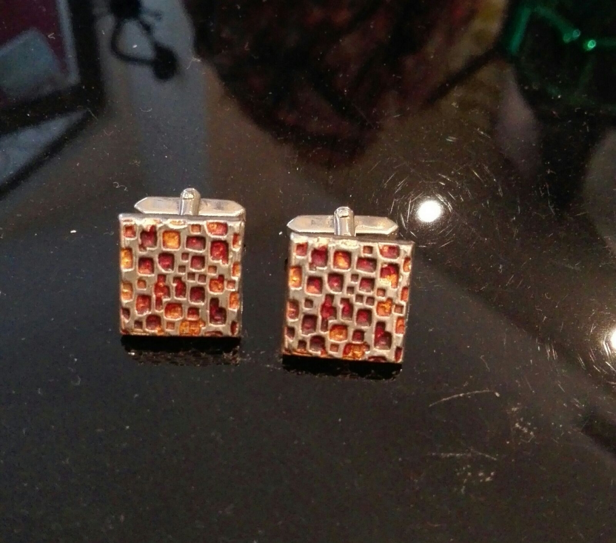 Très belle paire de boutons de manchette des années '60. Structure métallique dorée et motifs émaillés orange et rouge. Objet rare et "collector".