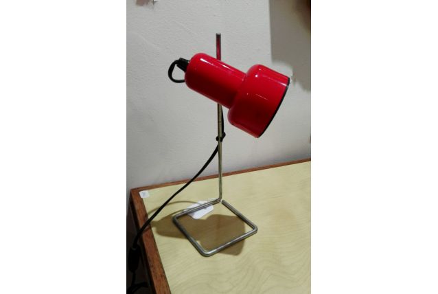 Petite lampe de bureau des années ' 60. Tige métallique chromée et abat jour en métal laqué rouge. Prête à vous éclairer.