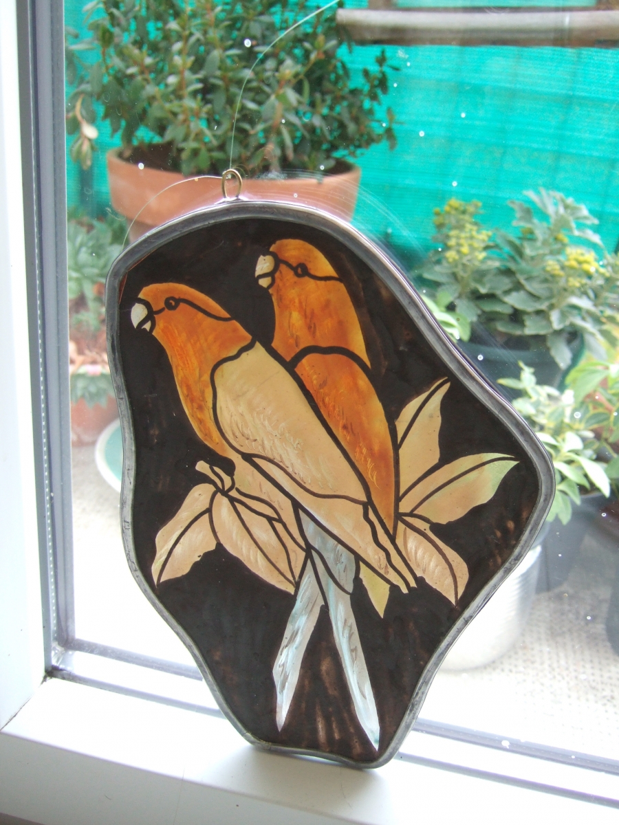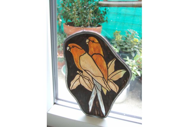 Petit vitrail couple de perruches,orange,bleu-attache de cuivre pour le suspendre devant une fenêtre-sertissage au plomb,couleurs émaillées et dessin à la grisaille-22 cm de hauteur x 15 cm de large-