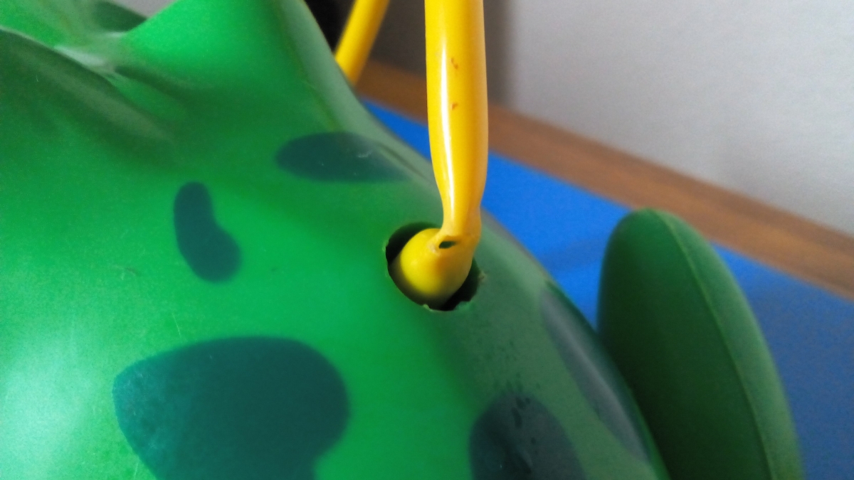 La grenouille est en bon état. Le tube plastique qui relie la grenouille à la poire est fendu à la base (voir photo). Cela n'empêche néanmoins pas son fonctionnement et pourra si la personne le souhaite être facilement réparer.
