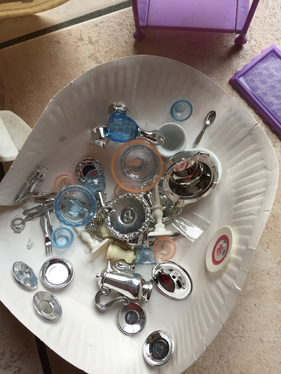 Meuble de salle à manger, table Barbie et dînette importante (assiettes, couverts, verres, plateau)
