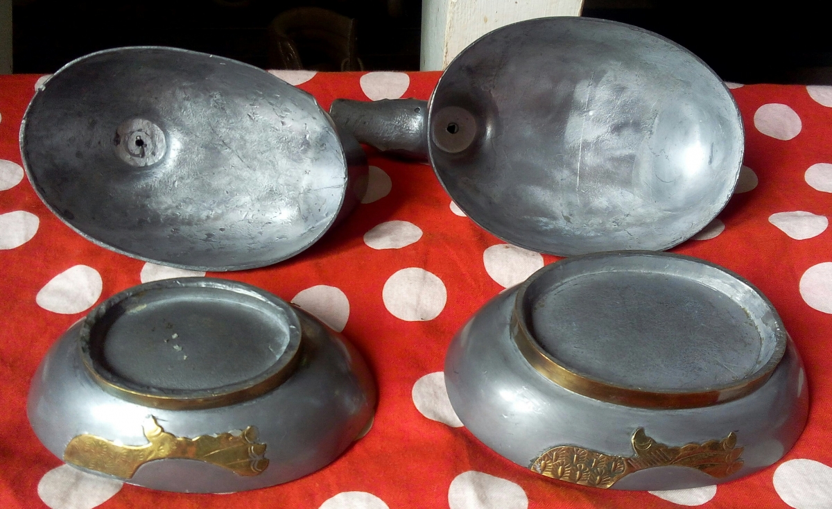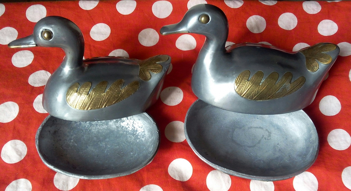 Lot de deux canards boite/vide poche en étain et ornements en laiton.
