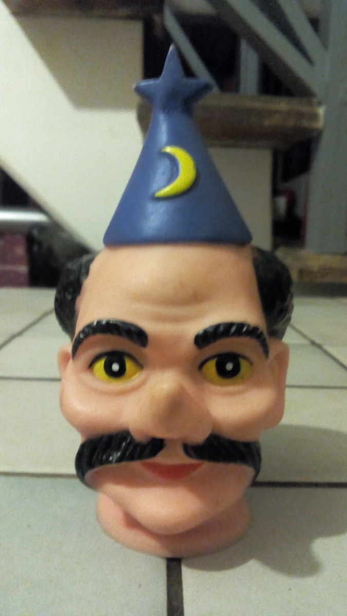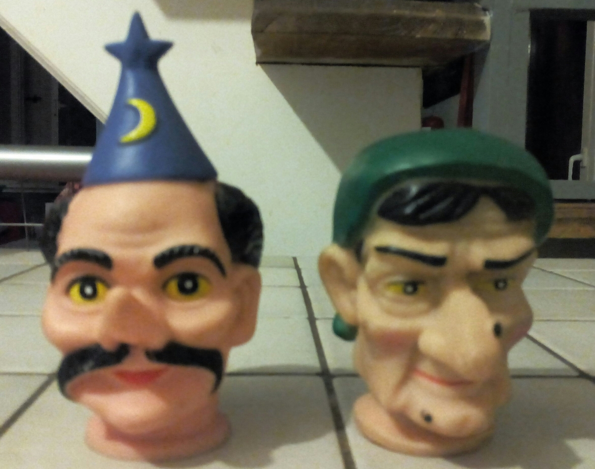 Sympathiques têtes de marionnettes vintage en caoutchouc : le magicien et le sorcier.