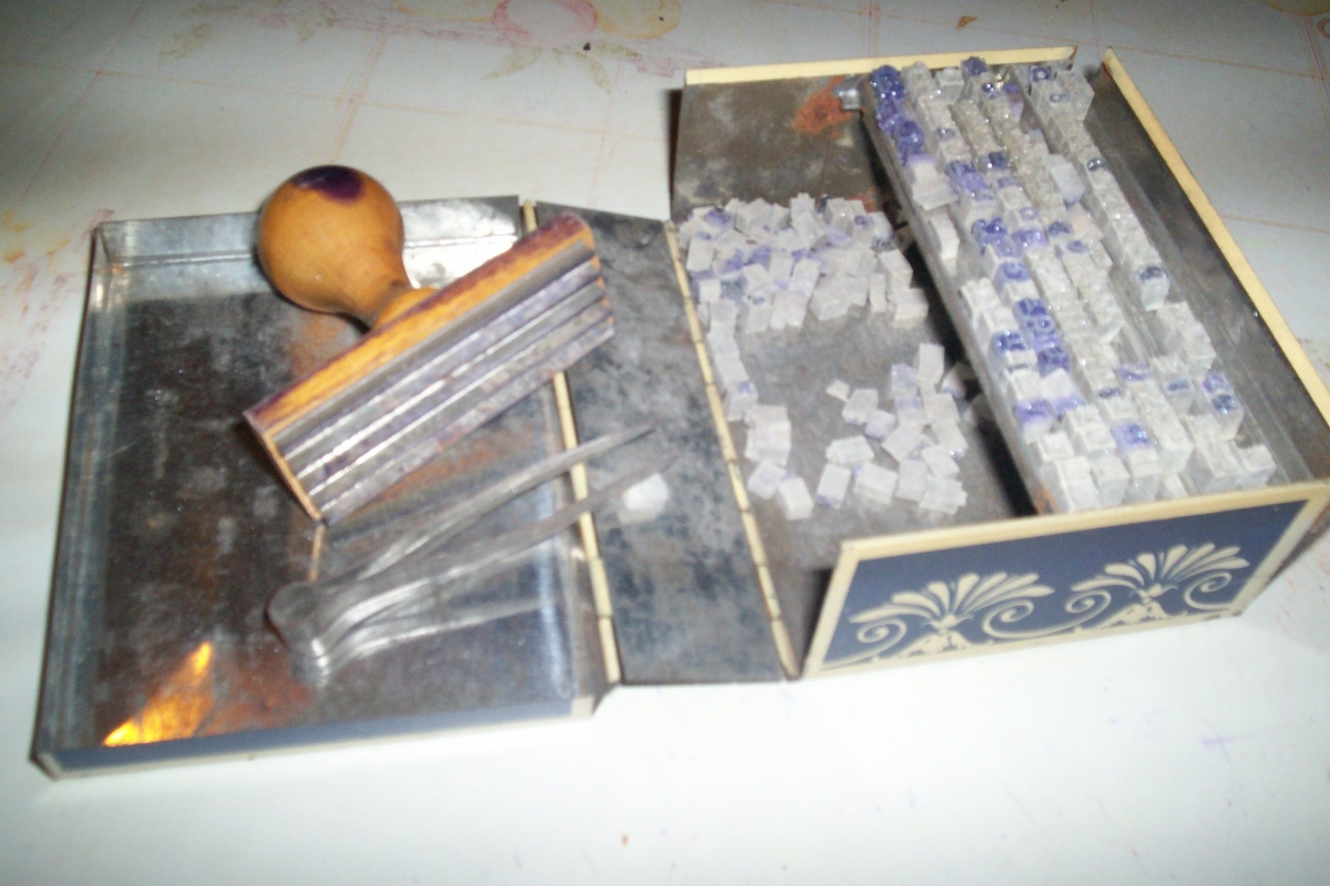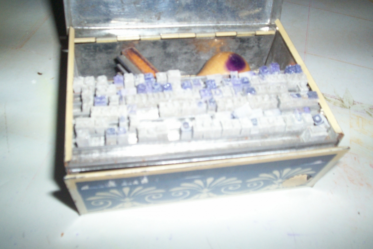 boite métal d'imprimerie commerciale la mondiale avec racks et lettres + tampon objet ancien en bon état 12 cm de longue 9 cm de large et 5 cm de hauteur .