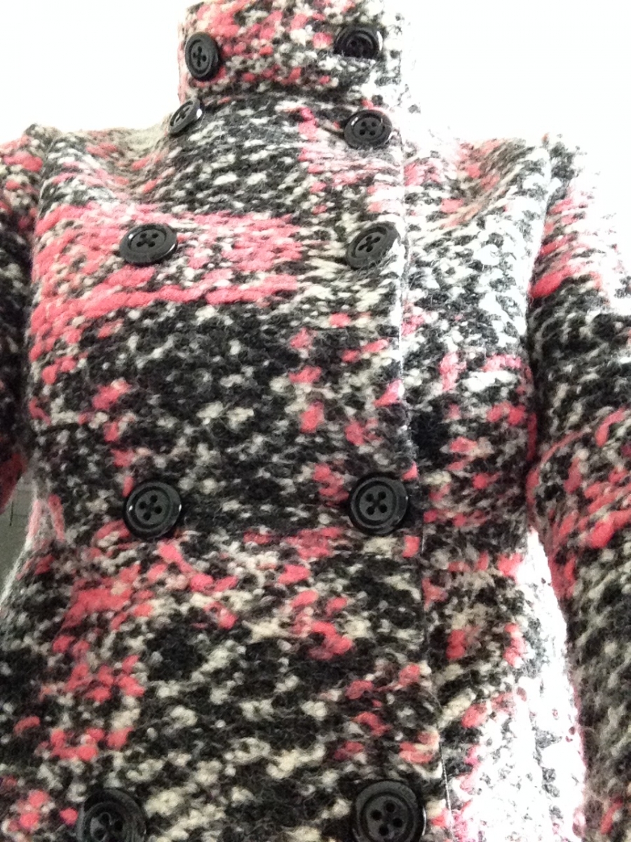 Veste croisée en lainage bouclette 3/4, tres belle portée, tres mode avec ses couleurs de rose, noir et gris. État neuf. Aussi élégante avec un jean qu'avec un vêtement plus habillé.