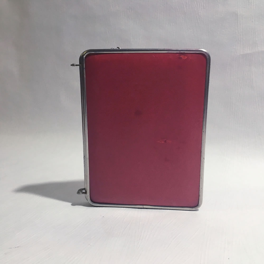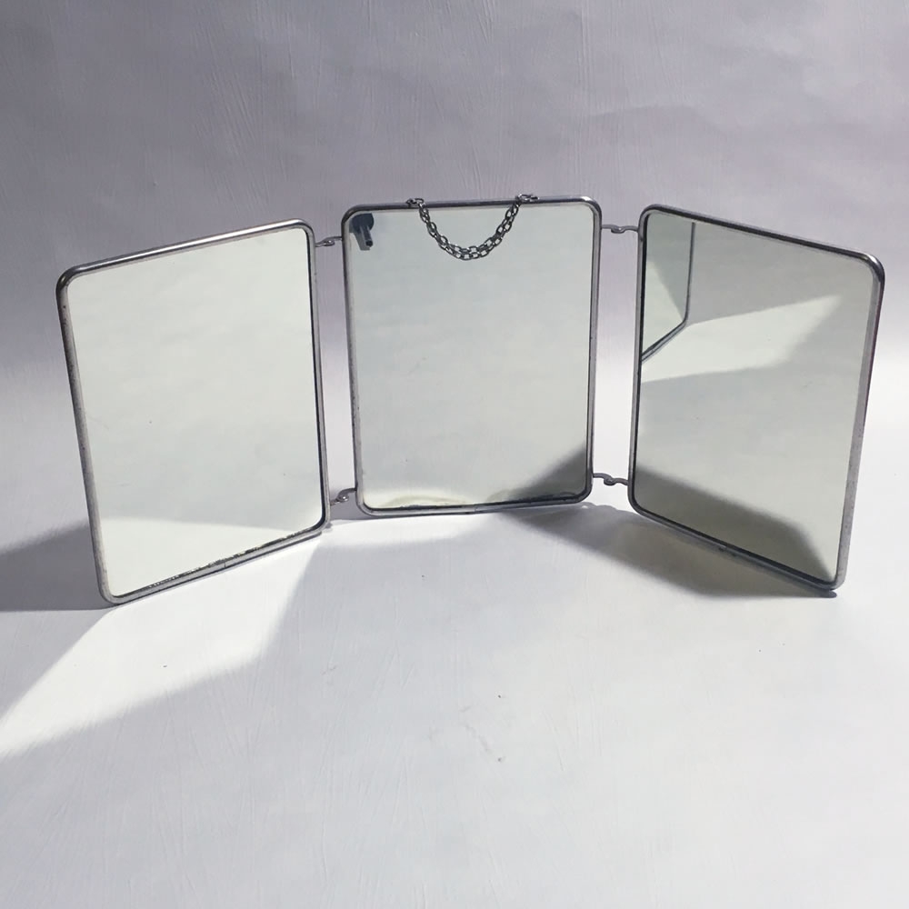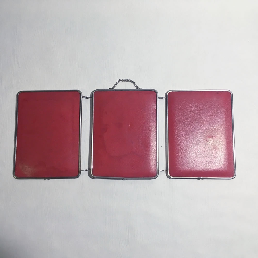 Un souvenir du temps où tous les ménages français ne disposaient pas des salles de bains suréquipées d'aujourd'hui... Trois panneaux de L18xH24 cm, miroir, fer et carton bouilli imitation cuir.
