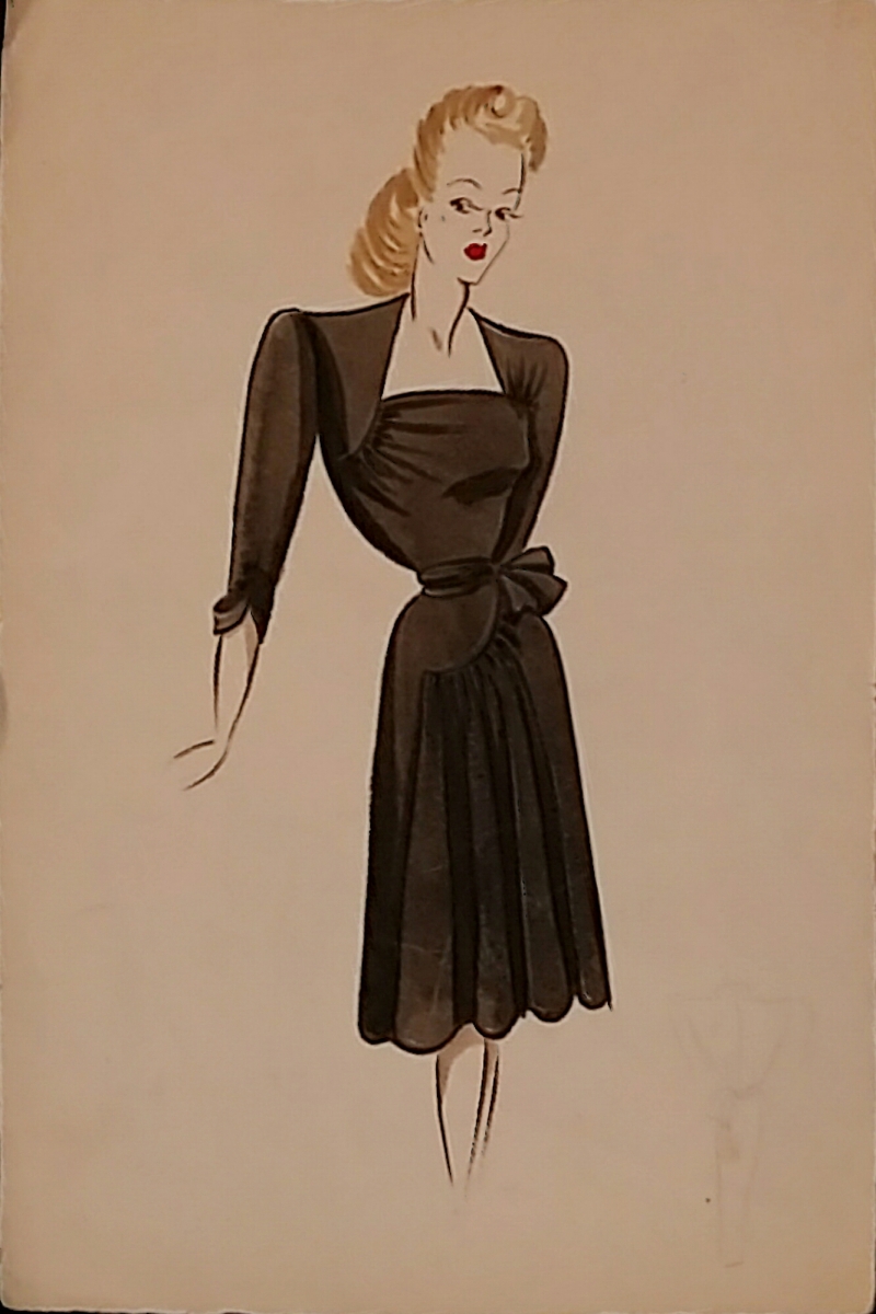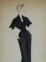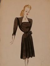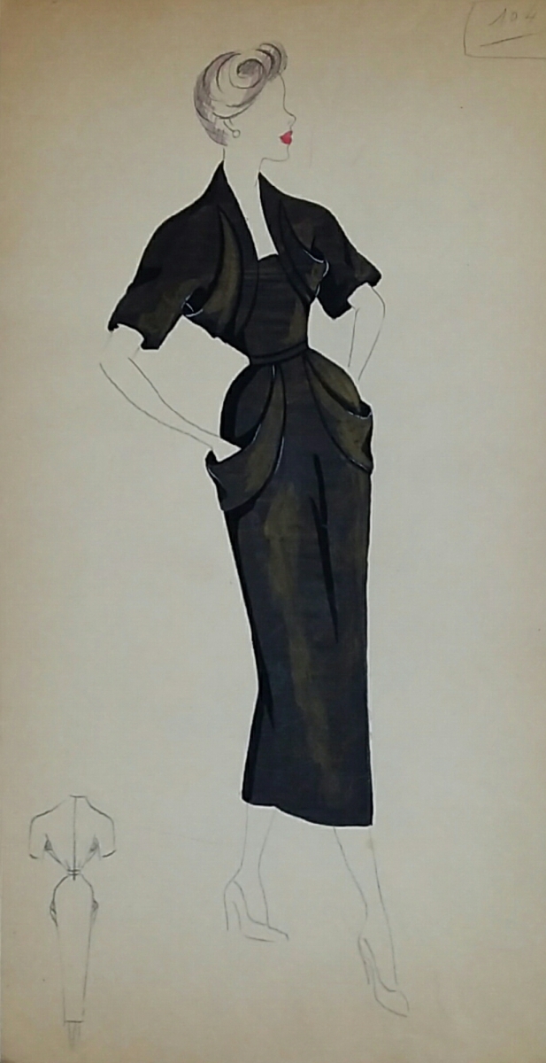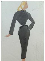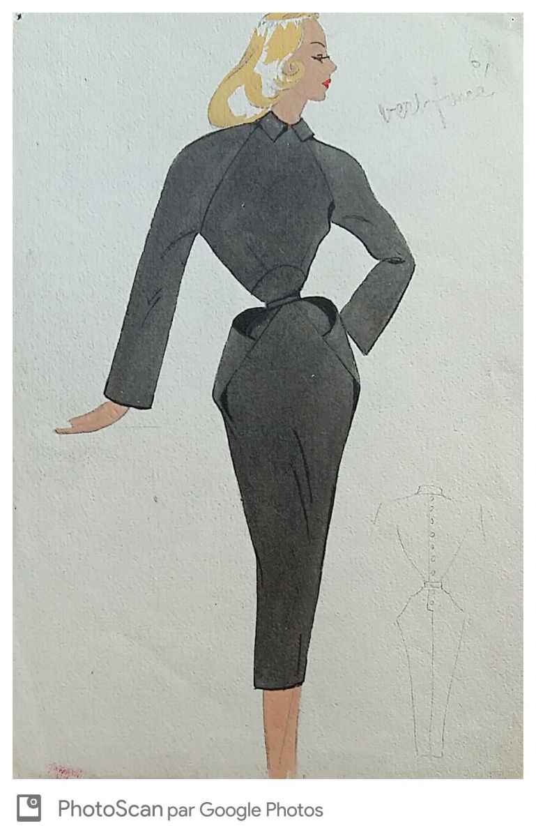 Ces croquis ne sont pas signés mais certains comportent des indications (la matière par exemple "Laine", "Dos", "Haut" et le croquis de dos et parfois en couleur ou non, parfois un détail du vêtement).