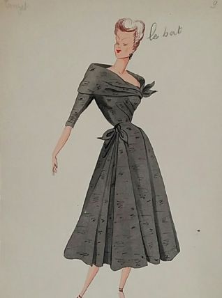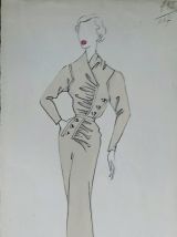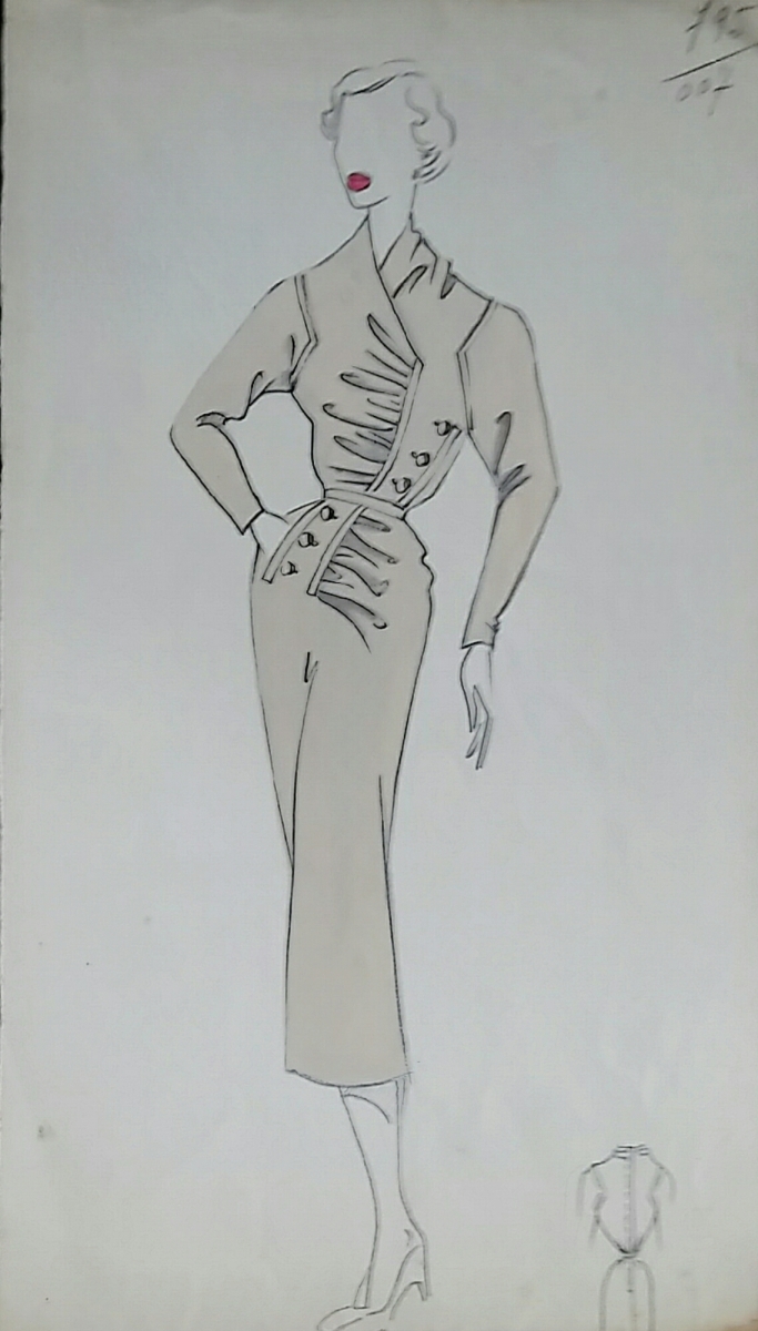 Croquis de mode 1950 de styliste pour la réalisation de robes et manteaux sur papier épais, papier à dessin.