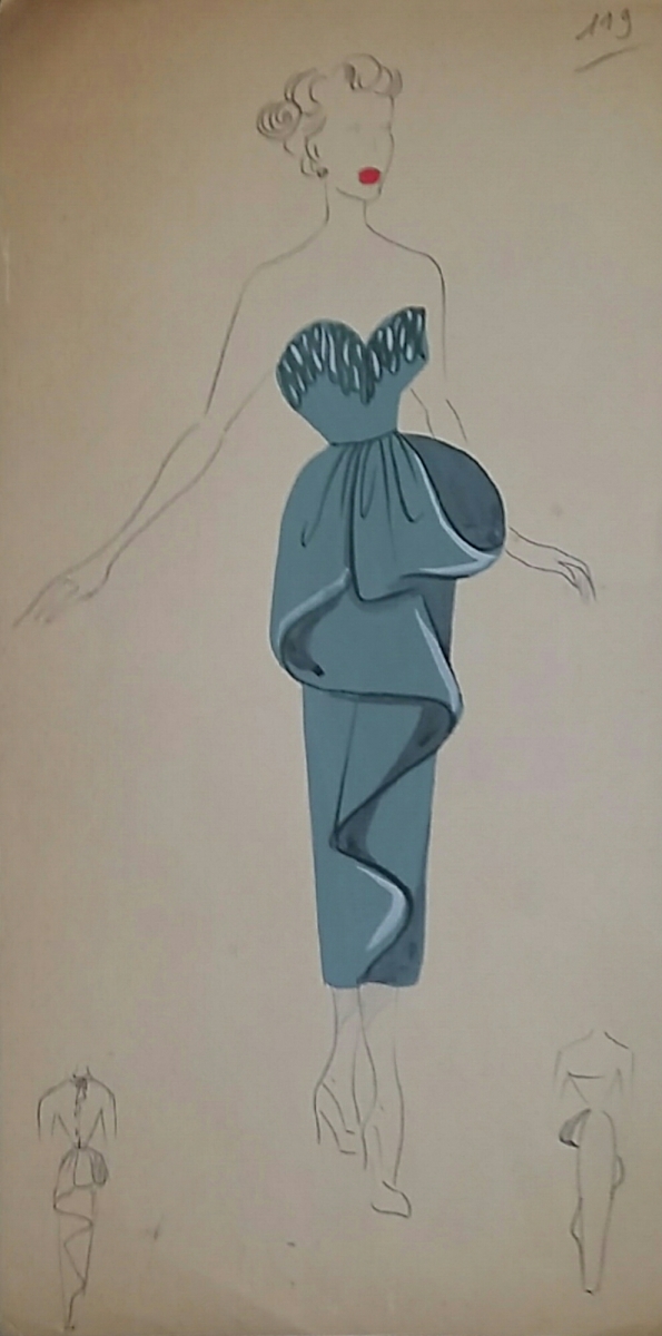 Croquis de mode 1950 de styliste pour la réalisation de robes et manteaux sur papier épais, papier à dessin.