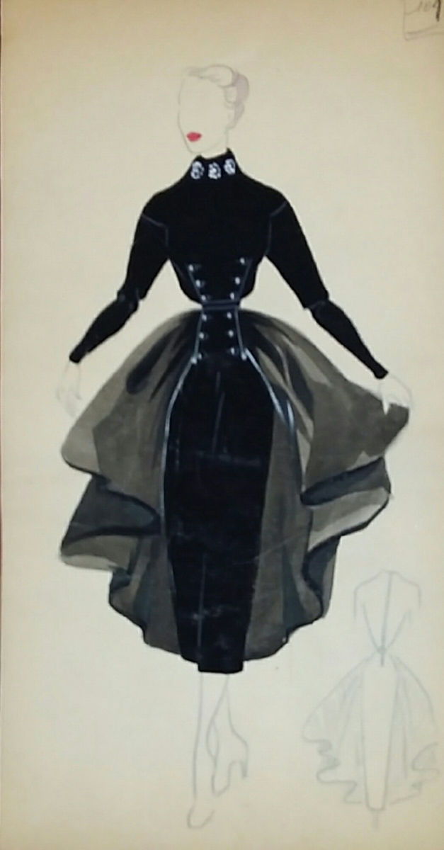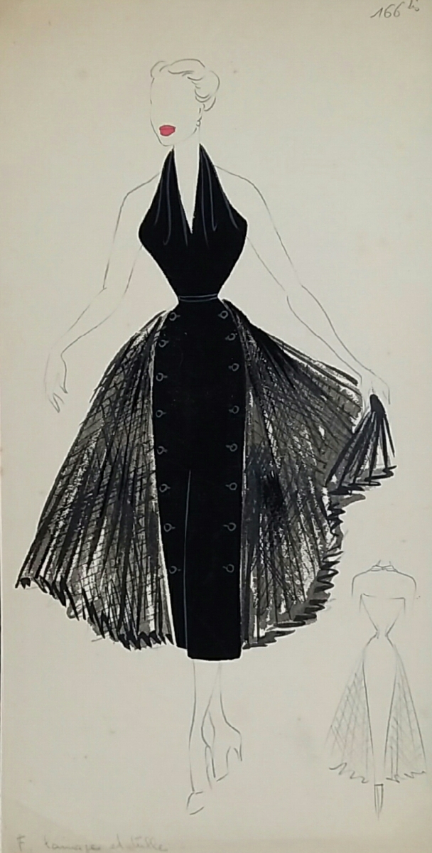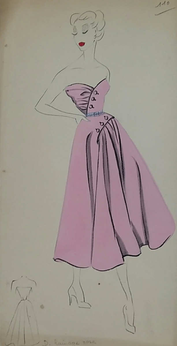 Ces croquis ne sont pas signés mais certains comportent des indications (la matière par exemple "Laine", "Dos", "Haut" et le croquis de dos et parfois en couleur ou non, parfois un détail du vêtement).
