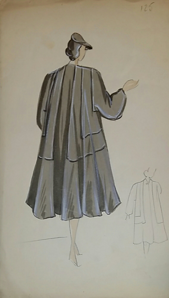 Ces croquis ne sont pas signés mais certains comportent des indications (la matière par exemple "Laine", "Dos", "Haut" et le croquis de dos et parfois en couleur ou non, parfois un détail du vêtement).