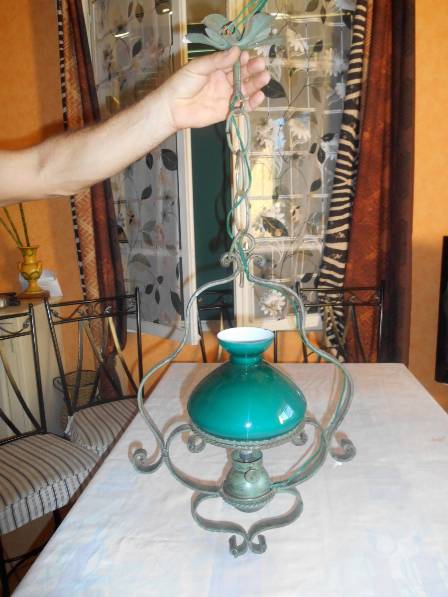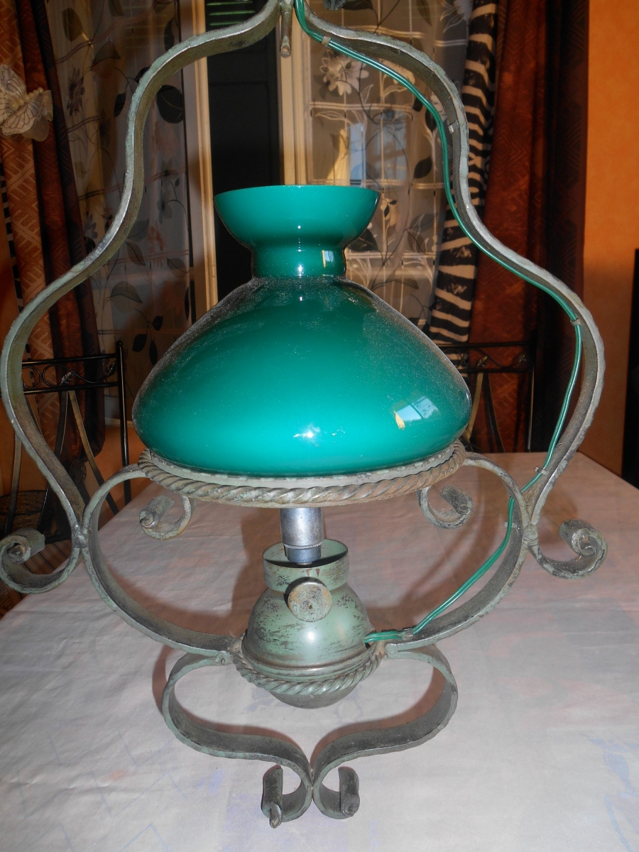 beau lustre en fer forgé style lampe à pétrole avec globe couleur vert