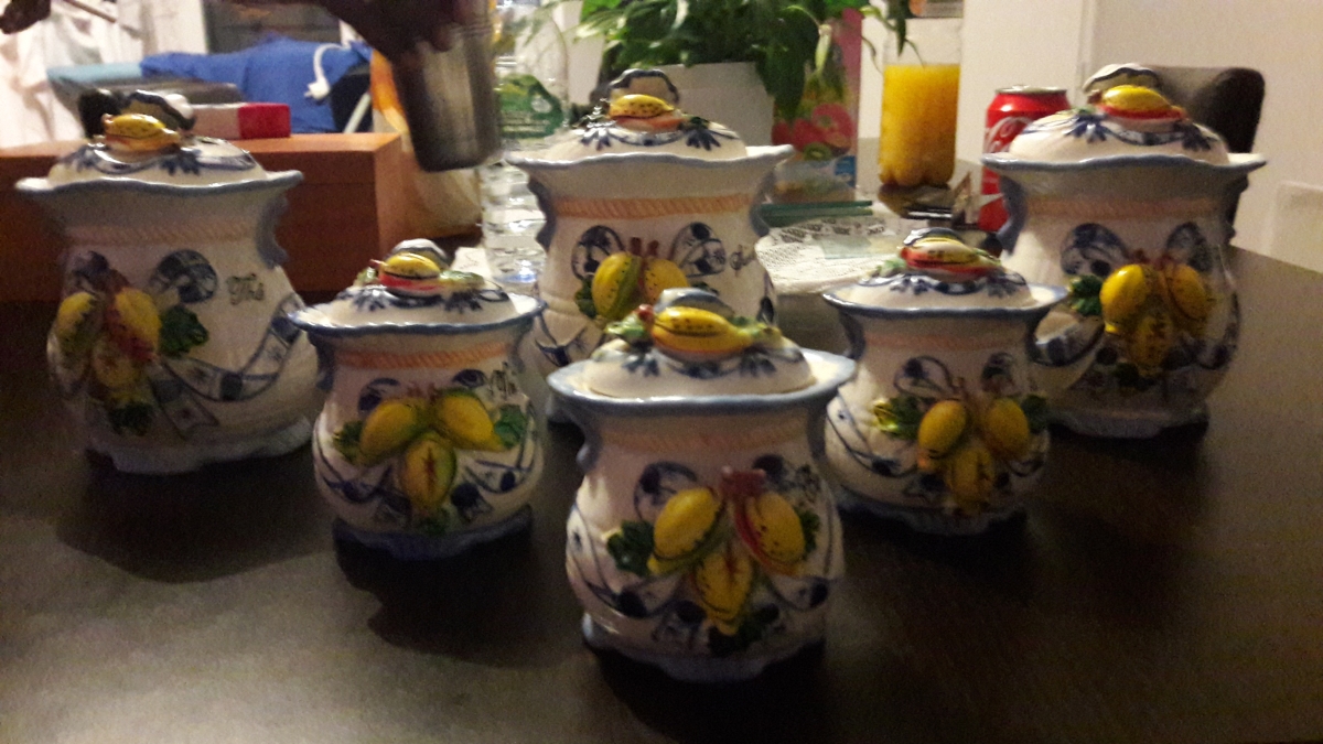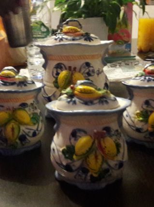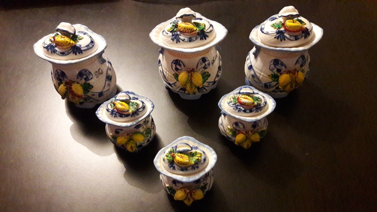 lot de 6 pots en céramique; 1 grand pour le sucre, 1 grand pour le café, 1 grand pour le thé et 3 petits; qui viendront bientôt embellir votre cuisine.