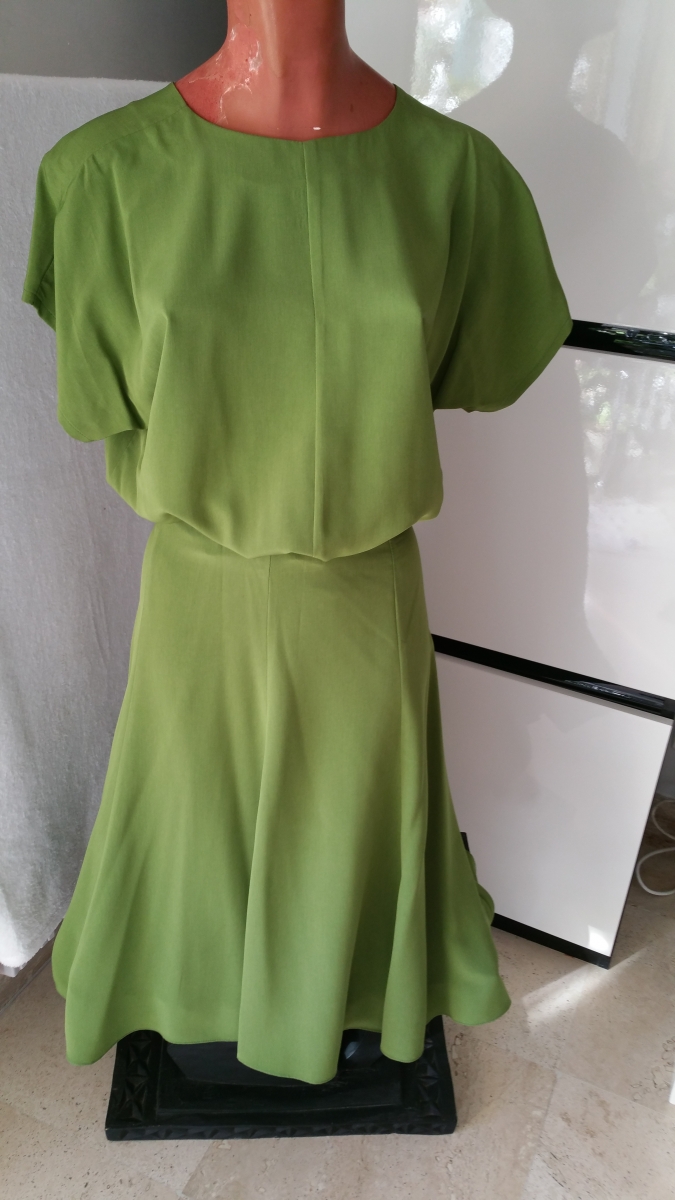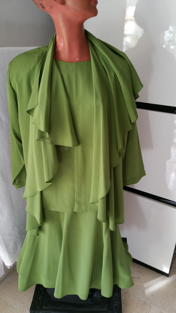 Ensemble flou, veste manches longues grand col drapé, top manches courtes, jupe mi-longue à godets, tissus soyeux, en très bon état