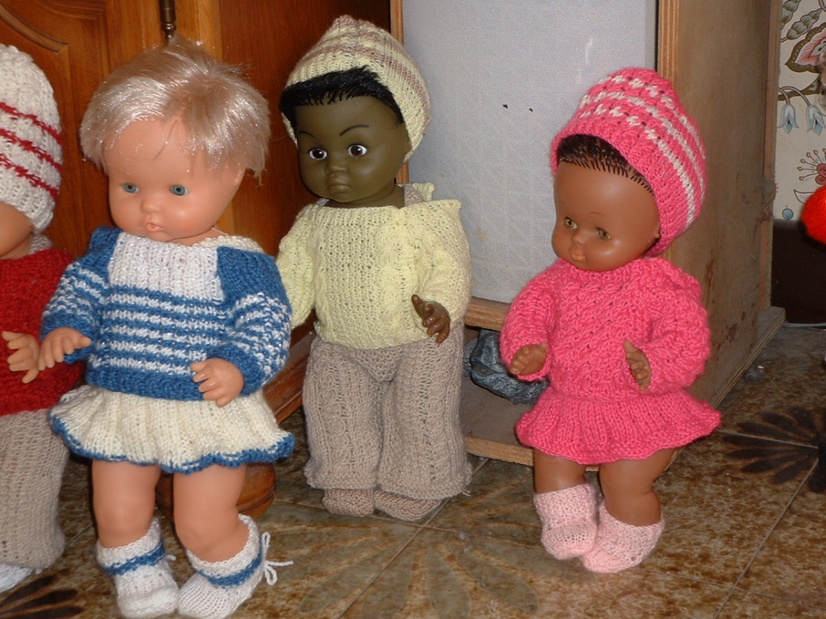 Poupées, baigneurs, très bon état. Habillés de vêtements tricotés artisanalement. (prix 4€ les moyennes et 5 € les plus grandes). Je peux envoyer à domicile, mais comptez les frais d'envoi en plus. Je reste à votre disposition pour tout renseignement complémentaire.