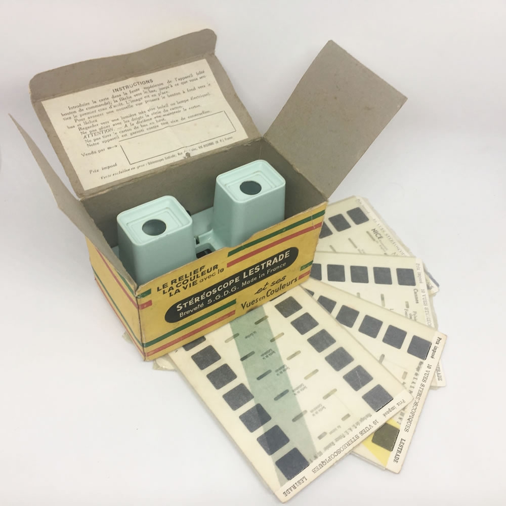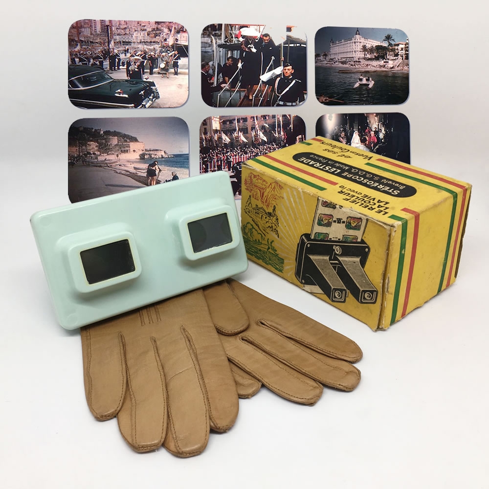 Passe-vues stéréoscopique Lestrade bleu dans sa boîte d'origine, avec deux planches d'actualité sur le mariage de Grace Kelly et du Prince Rainier, et deux planches touristiques sur Nice et Cannes dans les années 50, pour vous replonger dans une ambiance "La Main au collet"...
