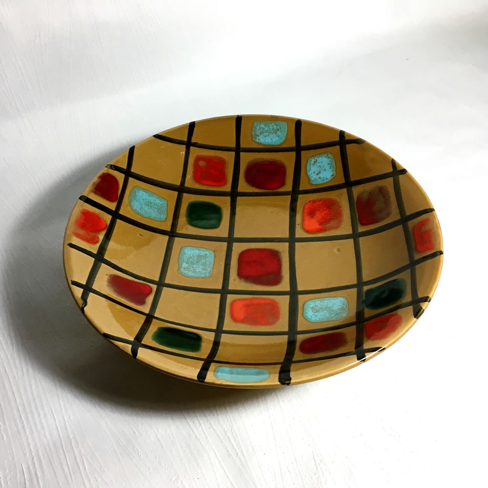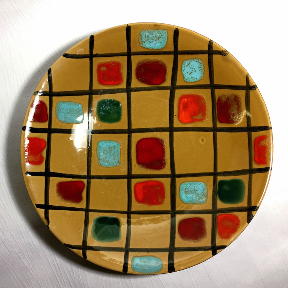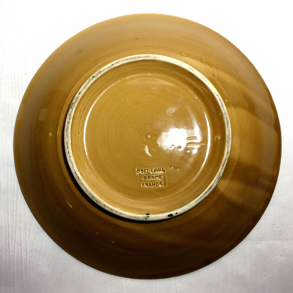 Grand plat en céramique ocre à motifs géométriques 'flous' turquoise, rouge orangé, carmin, vert sapin et noir des années 60, issu des ateliers de Poet-Laval. Non signé, probablement "Didier" (il existe au moins un autre objet à motif identique portant cette signature)