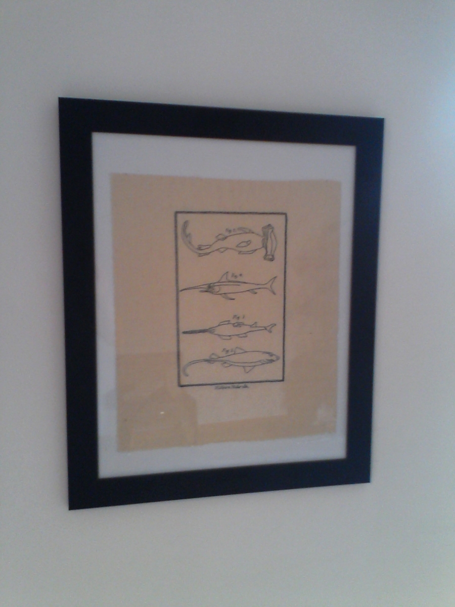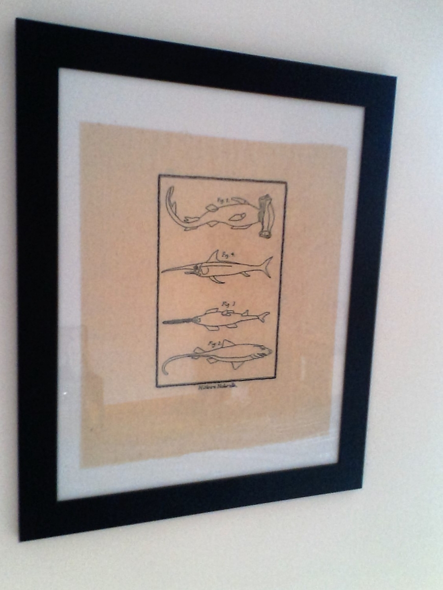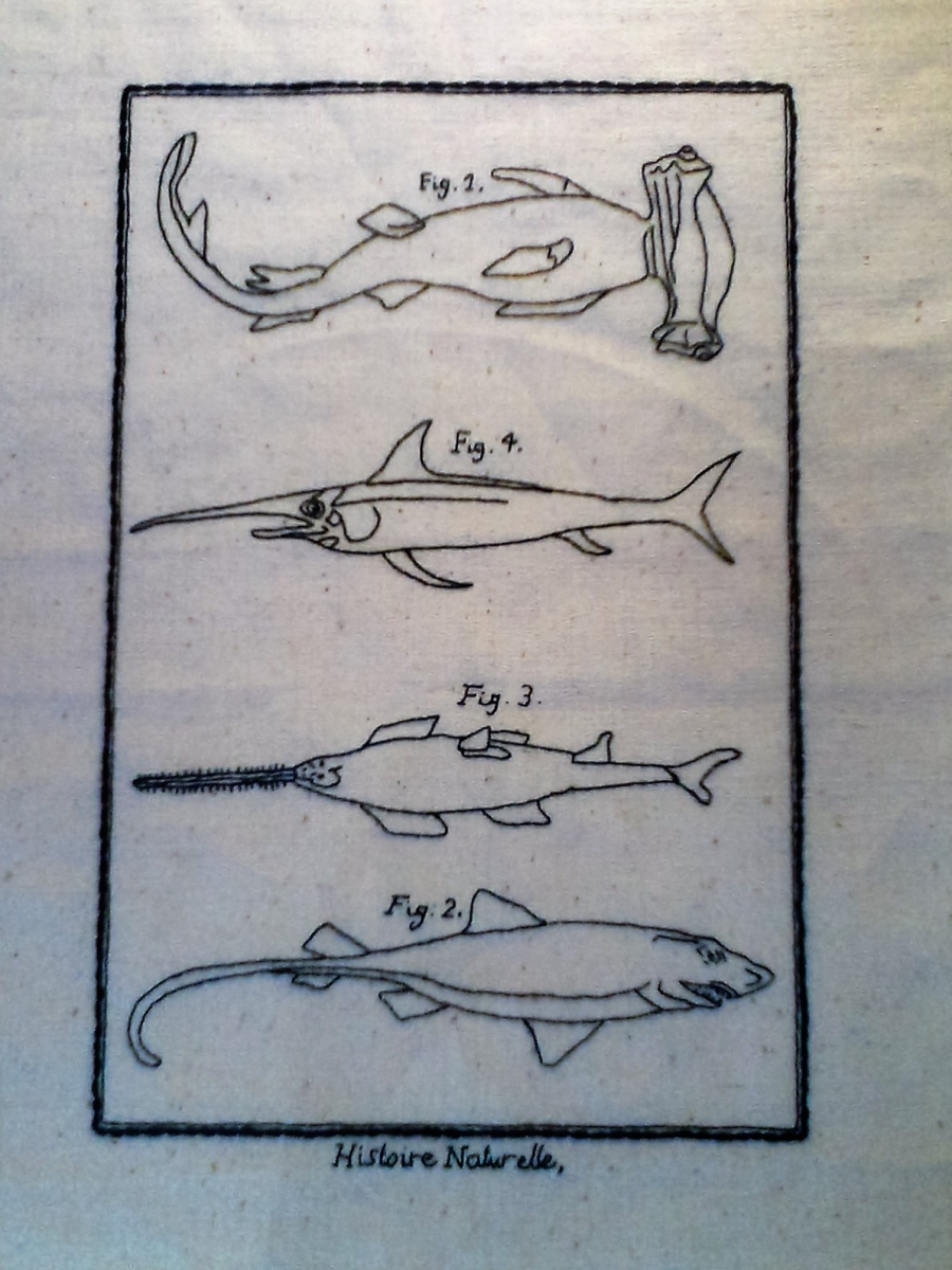 Broderie type planche naturaliste en fil coton noir sur toile de lin. Vendu encadré.
