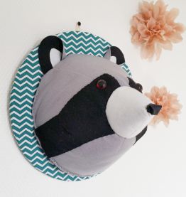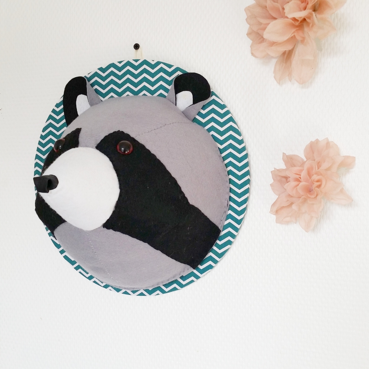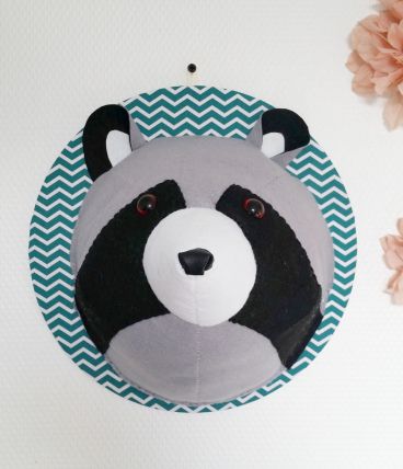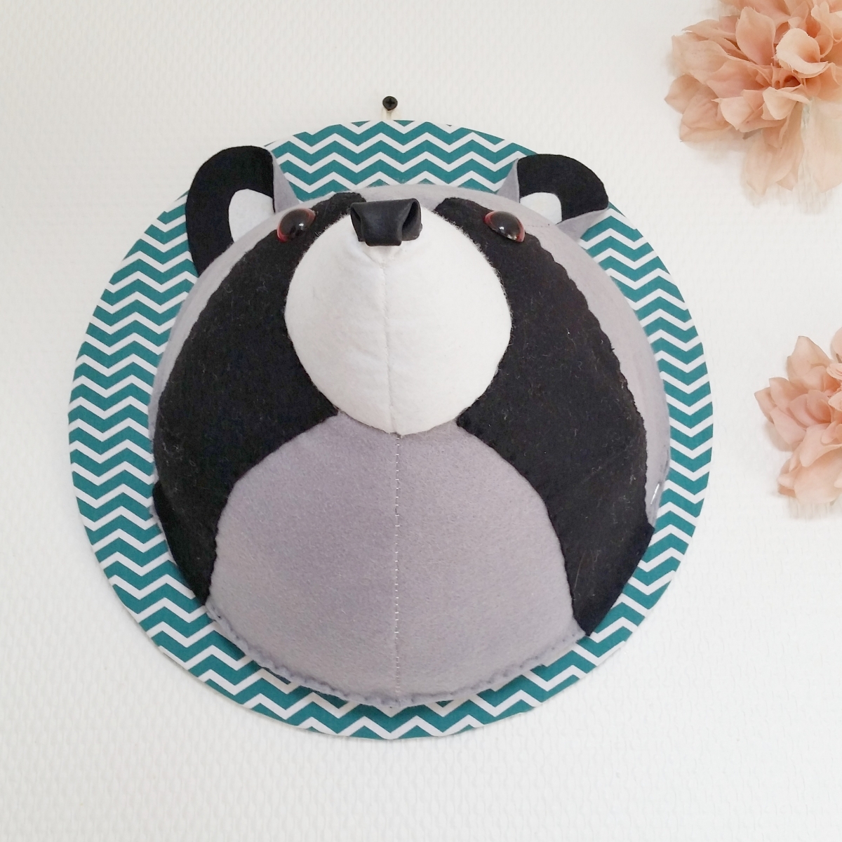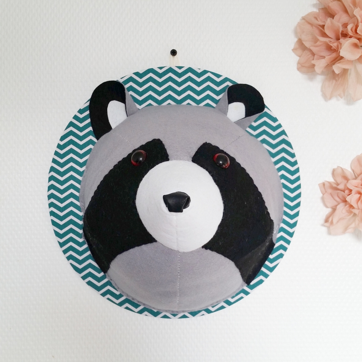 Faux trophée de raton laveur entièrement fait main en feutrine avec accroché pour suspendre à un mur ! Parfait pour la décoration d'une chambre de bébé ou d'enfant !