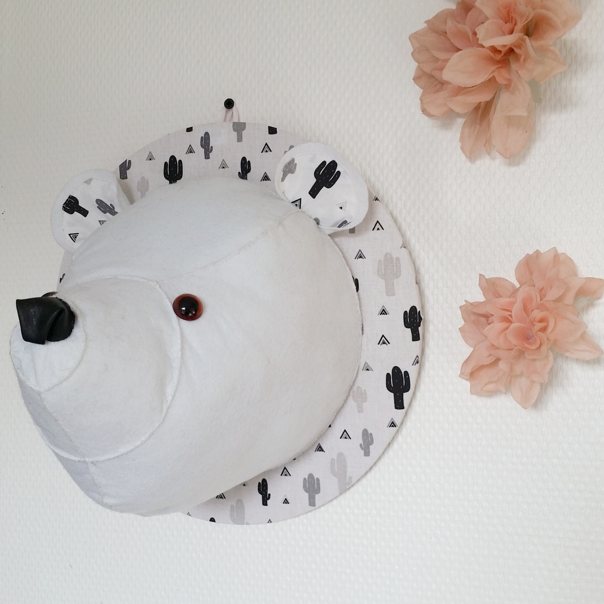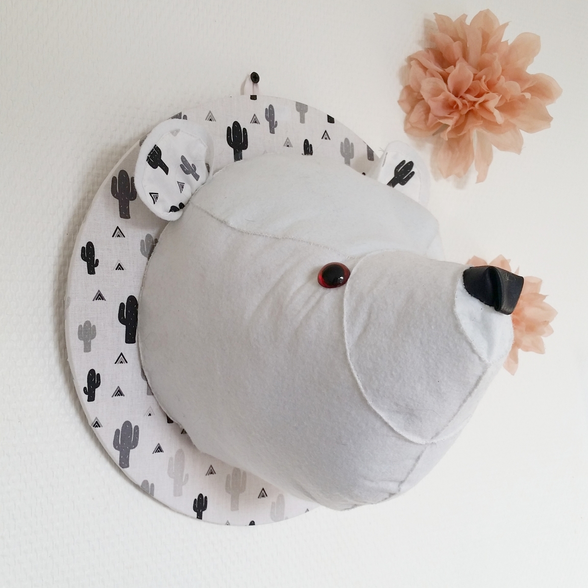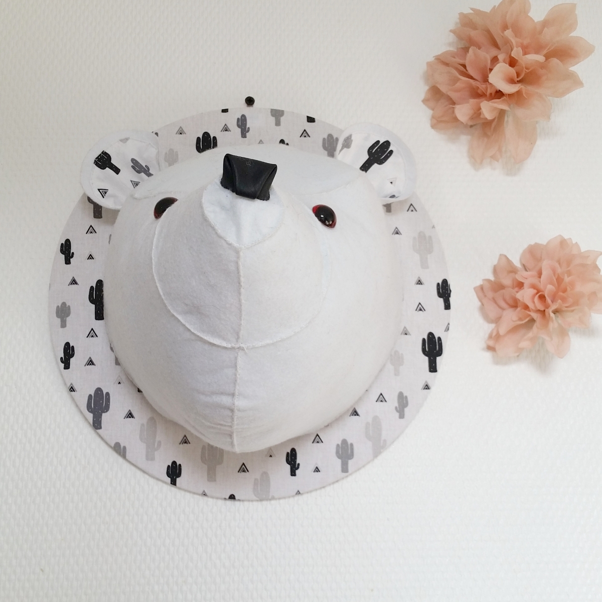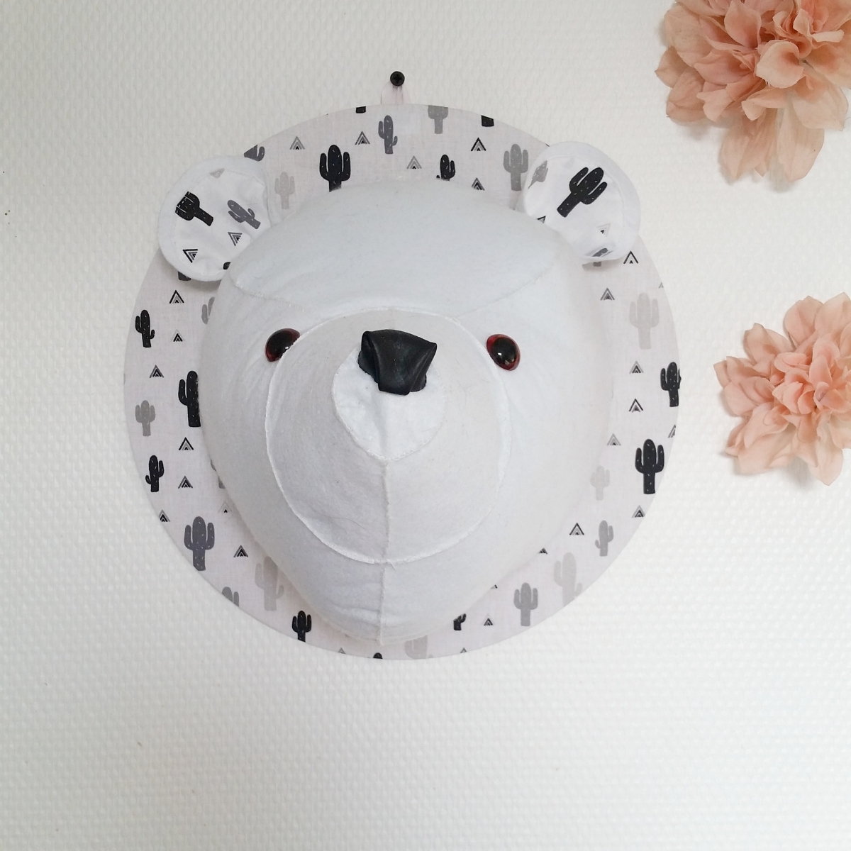 Faux trophée d'ours polaire entièrement fait main en feutrine avec accroché pour suspendre à un mur ! Parfait pour la décoration d'une chambre de bébé ou d'enfant !