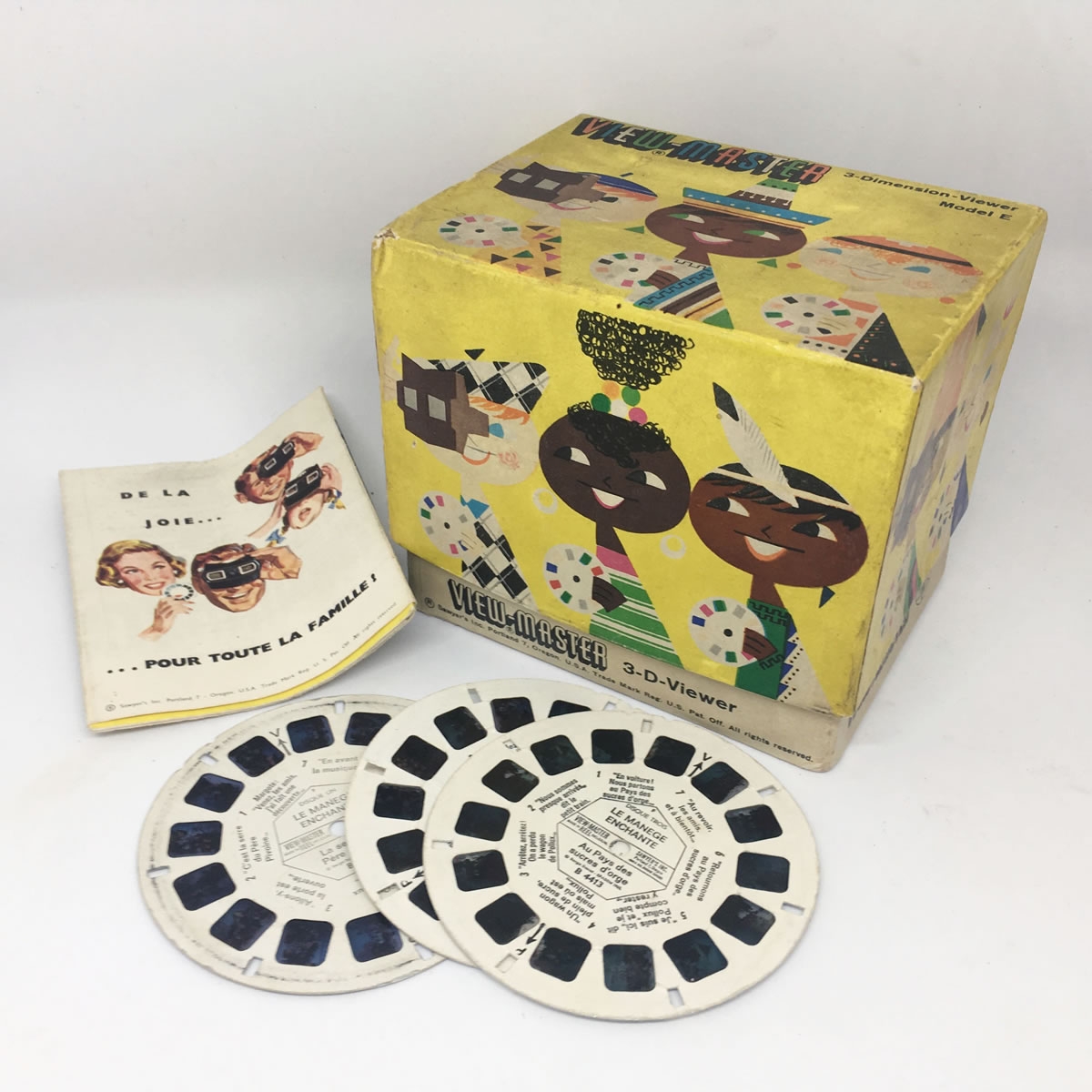 La 3D des années 60, c'était tout de même autre chose... Coffret (facile à emballer) de plaisirs coupables contenant une visionneuse 3D ViewMaster en bakélite, un catalogue de vues 1960 et trois disques d'histoires du Manège enchanté, le tout dans la boîte d'origine.