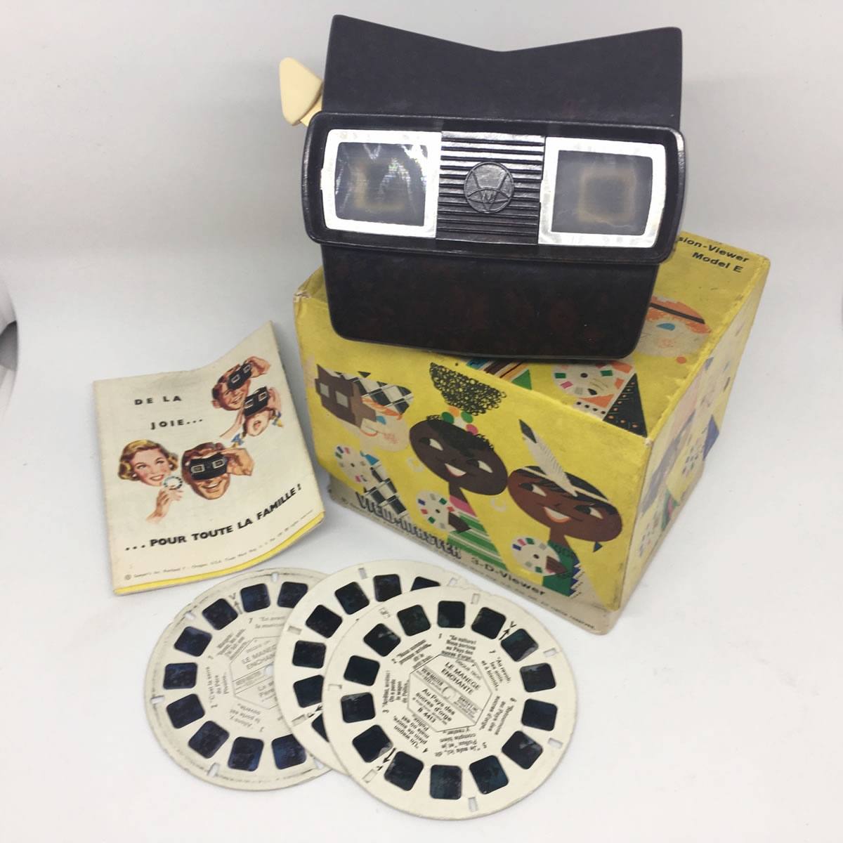 Visionneuse, disques et catalogue en bon état, les arêtes de la partie inférieure de la boîte ont quelques défauts mais le couvercle est tellement joli.