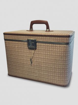 Valise ou mallette vintage trieur/organiseur de documents, en carton bouilli enduit vinyle, motif pied-de-poule beige et brun. Avec sa clef ! La poignée plastique et surtout la typographie des dossiers suspendus indiquent les années 70. Les traverses supportant les dossiers sont amovibles, il peut donc être facilement détourné de son usage d'origine ...