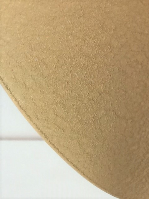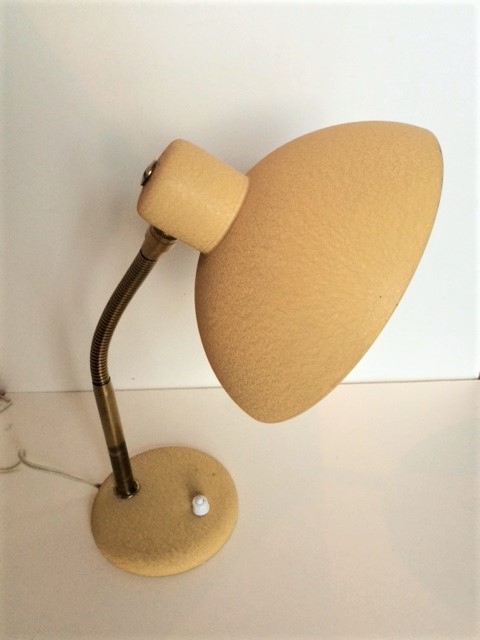 Lampe de bureau en métal grainé jaune pâle, pied semi-flexible. Hauteur : 40cm, largeur : 17,5cm, profondeur : 25cm.