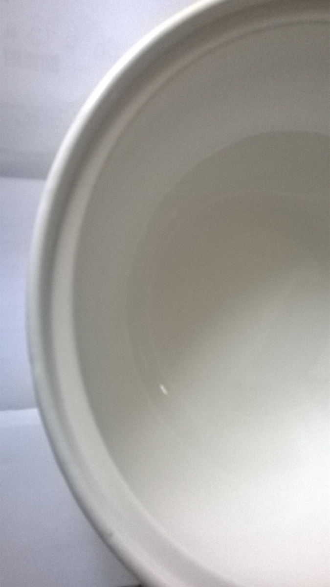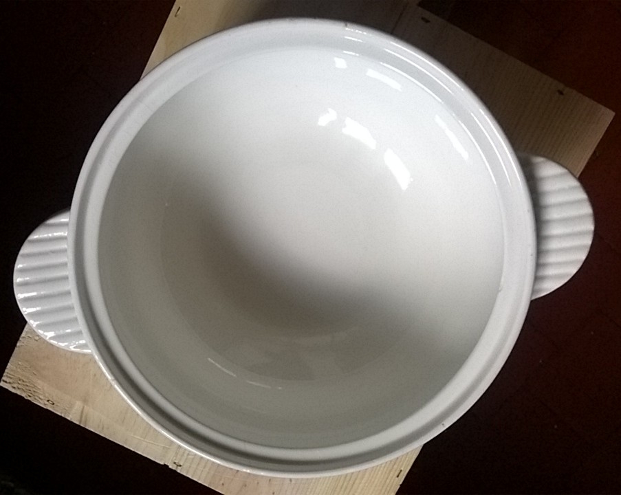 1 craquelure de 3 cm sur le bord du bol de la soupière, largeur d'un cheveu, et 4 mini éclats sur l'émail (photos 2 et 5).