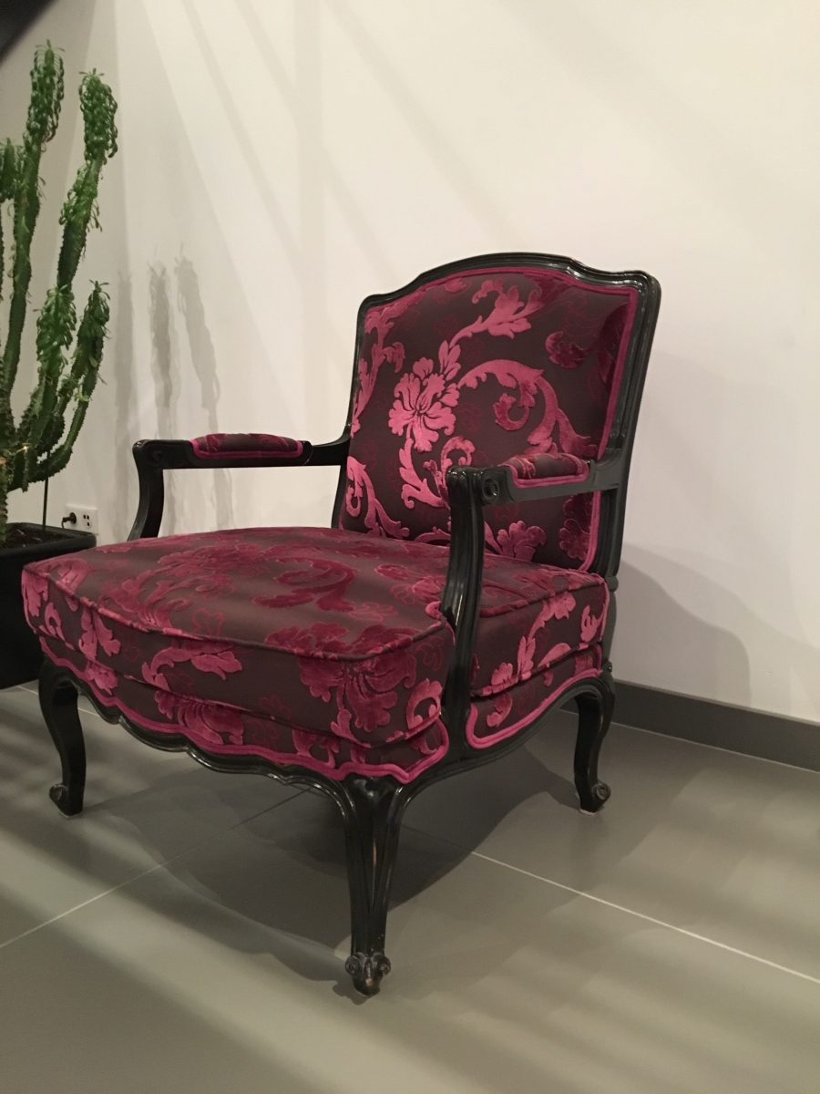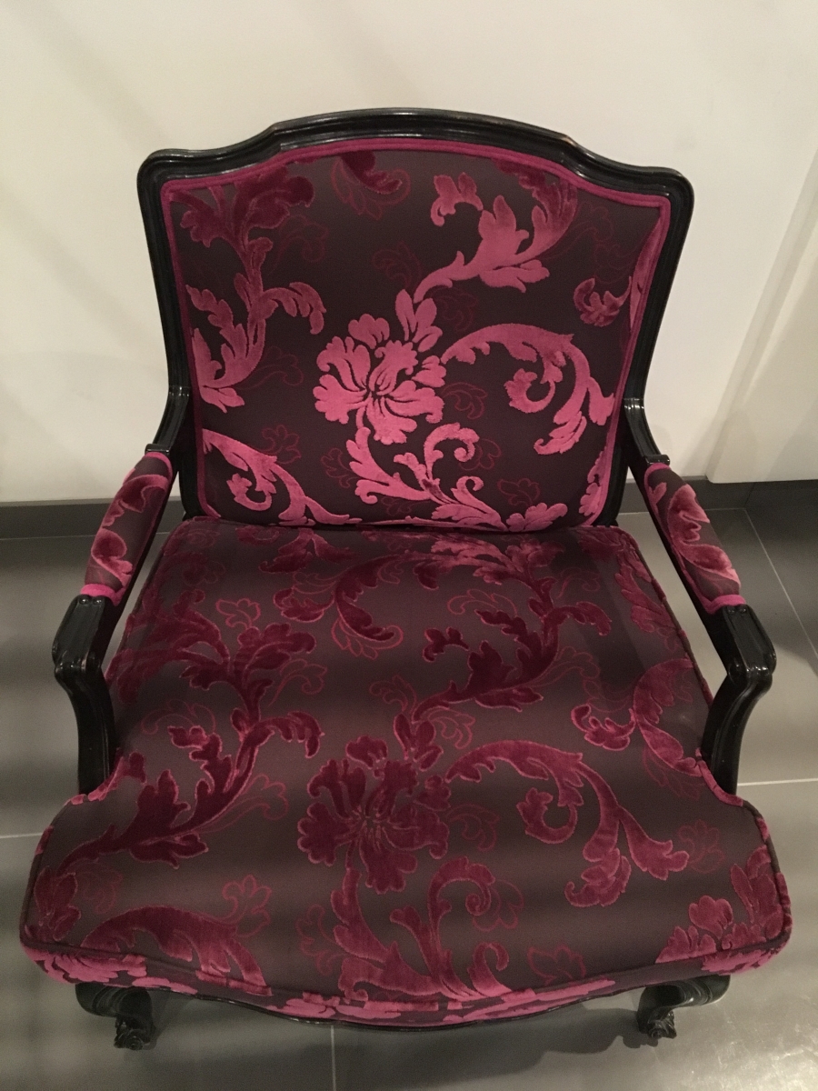 Melange de tissus (aubergine) et motif baroque velours (rose).