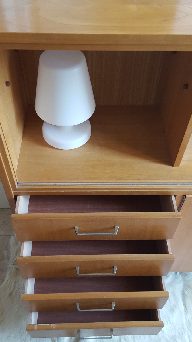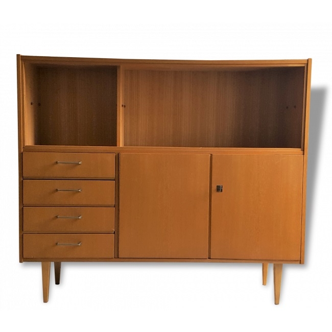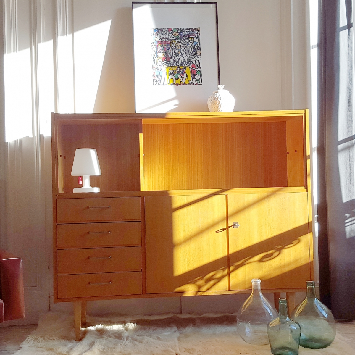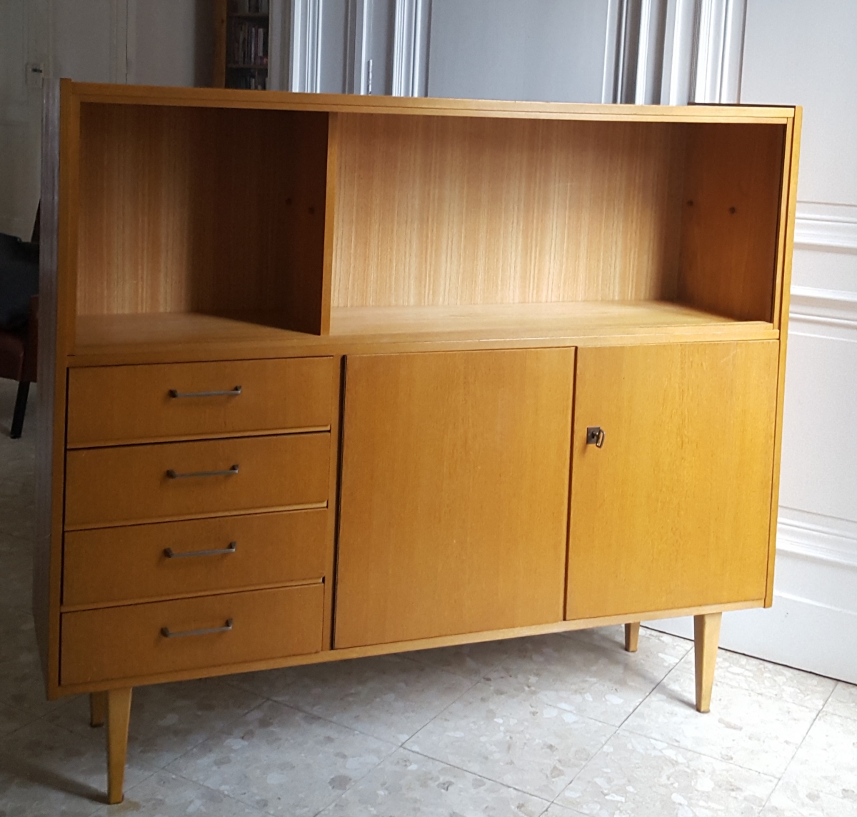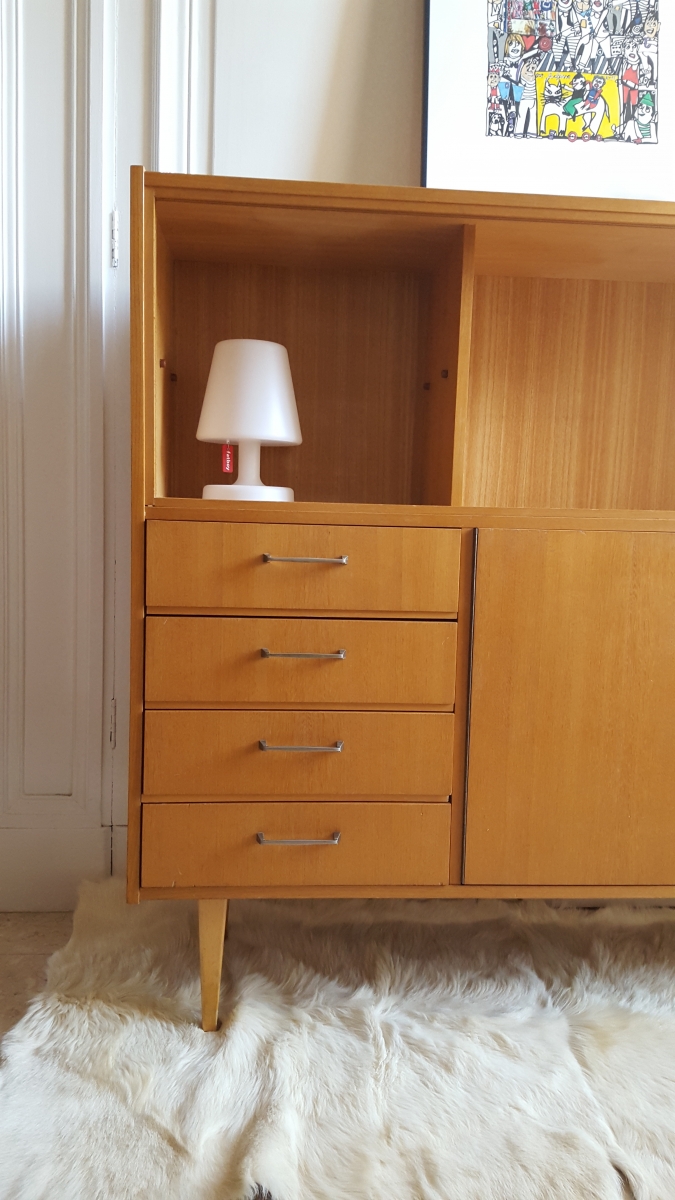 Très joli meuble en bois couleur miel aux pieds fuseaux pouvant servir d'enfilade ou de bahut. Il date de la fin des années 40. A l'origine il possédait une tablette en verre dans chacune des deux niches qui ont été enlevées (mais elles sont disponibles et en parfait état). Deux vitres fermaient également les deux niches mais elles ont été ôtées également pour un look plus contemporain. A gauche, ses 4 tiroirs ont conservé leurs poignées d'origine en laiton. Deux portes en bois sur la partie inférieure droite ouvrent sur deux étagères fermant à clé. Bon état malgré son âge. Son design scandinave et ses lignes épurées en font un meuble très contemporain et tendance. Ses dimensions lui permettent de s'intégrer facilement dans de petits espaces.