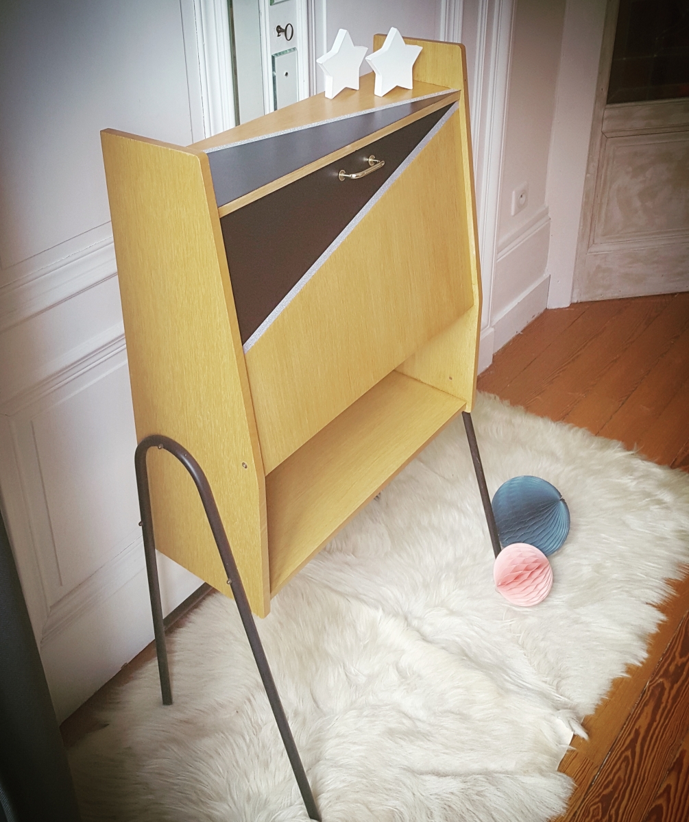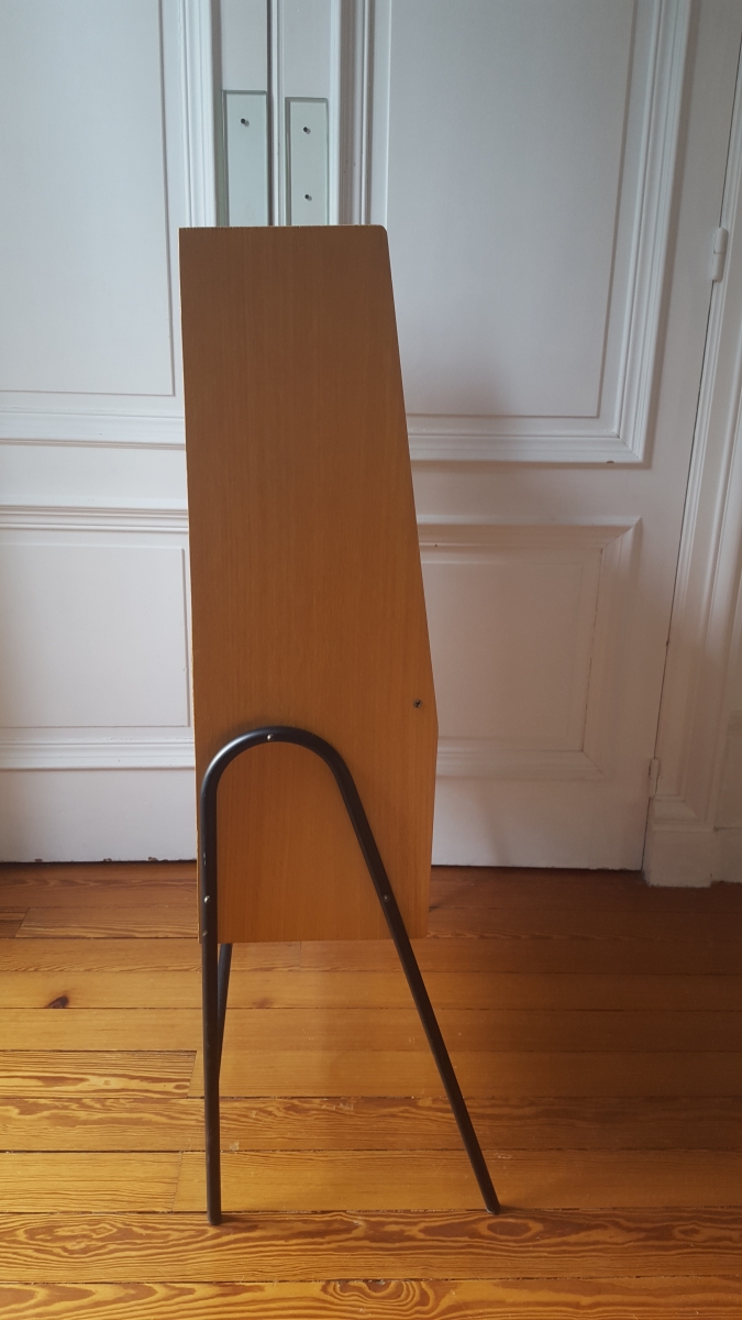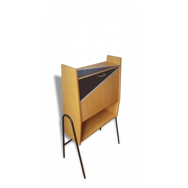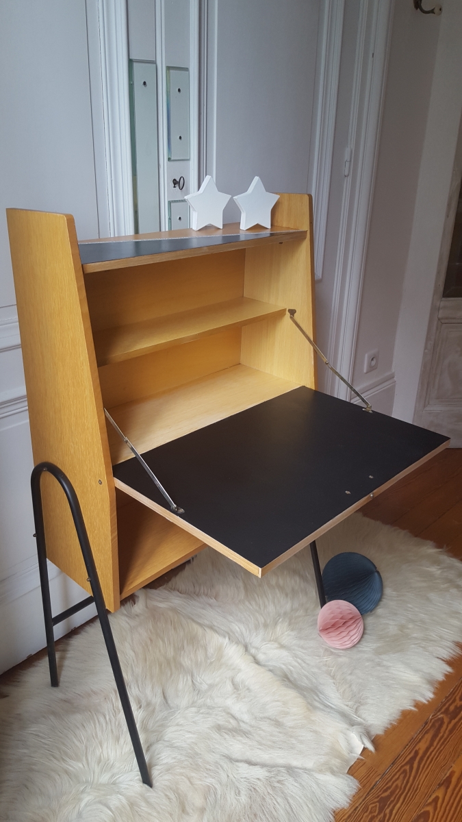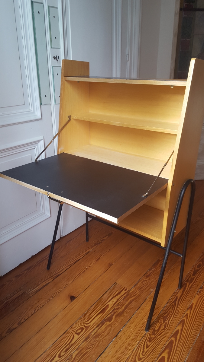 Très joli secrétaire pieds tubulaires du style Jacques Hitier des années 50 en bois. Il est numéroté. Il a été relooké en partie (peinture noire et papier pailleté gris) pour une touche plus actuelle. Très bon état malgré son âge. Ses lignes graphiques et design en fond un meuble à la fois pratique, élégant et contemporain. Son format léger s'adaptera aux petits espaces également. A noter que la profondeur du plateau une fois ouvert est de 62 cm. La profondeur indiquée dans les dimensions est celle avec le plateau fermé et prise au niveau des pieds.