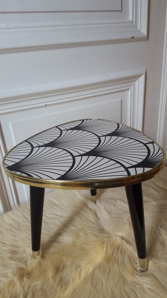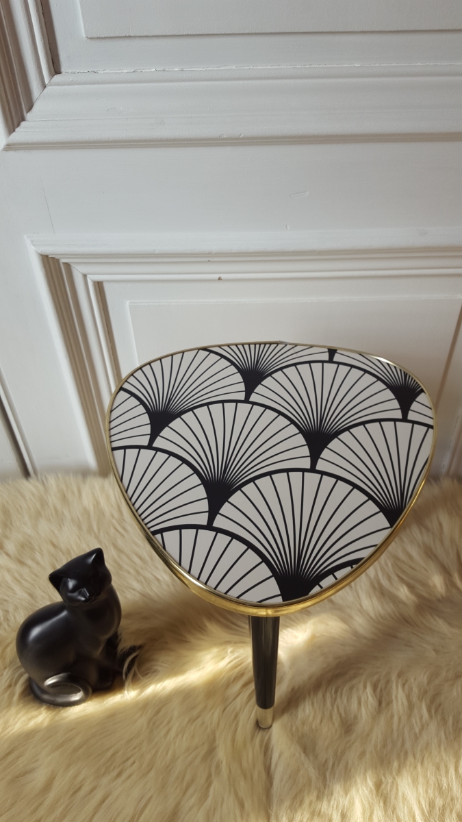 Jolie petite table tripode relookée avec du papier peint et protégée par un vernis mat. Le reste est dans son jus en très bon état. Pieds en bakélite noir et doré. Son nouveau look très "art déco" en fera un bel objet de décoration mais également un petit meuble d'appoint pour une plante ou une lampe.