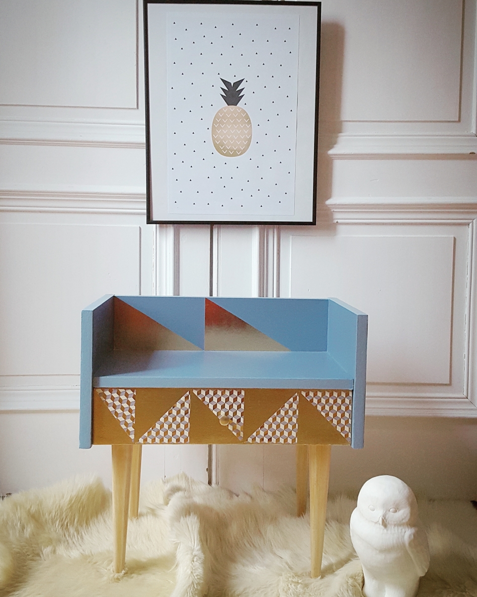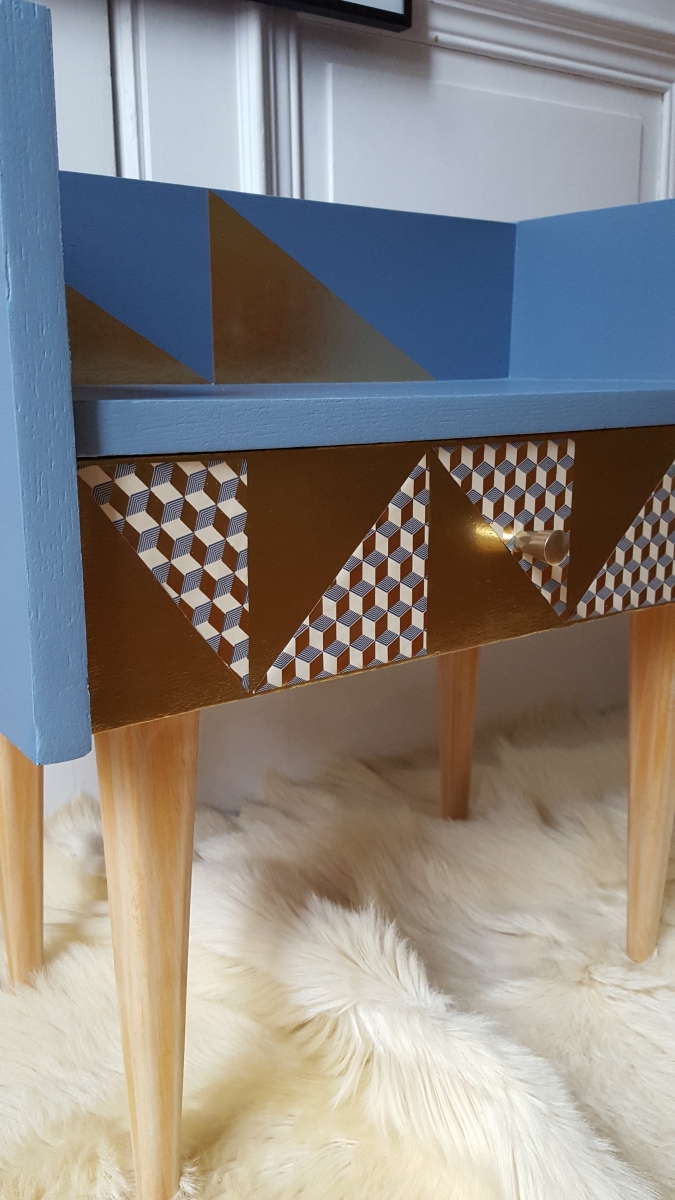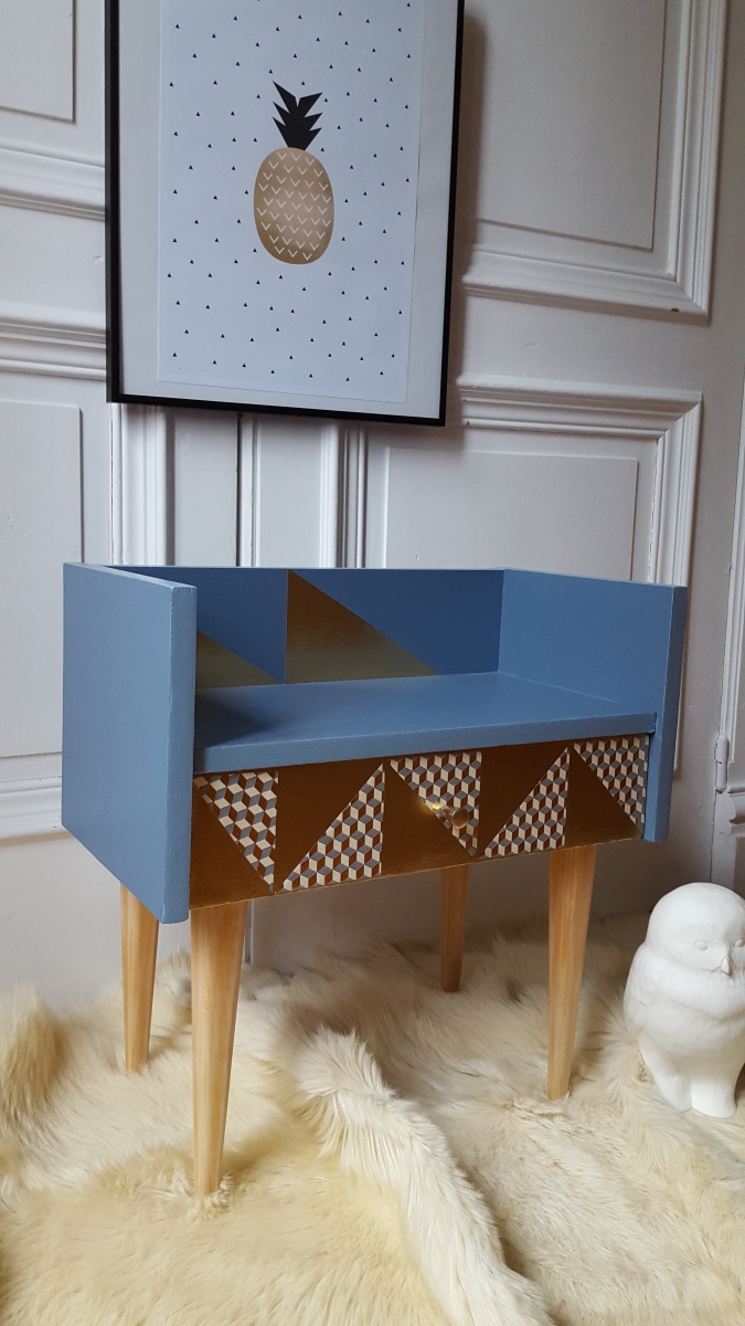 Jolie table d'appoint pouvant servir de chevet ou de bout de canapé. Elle a été relookée pour un style scandinave. Peinture bleu crépuscule et dorée, papier peint graphique bleu et doré. Les pieds fuseaux ont été décapés et cirés. La poignée d'origine est en laiton. Elle a été brossée pour retrouver tout son éclat.