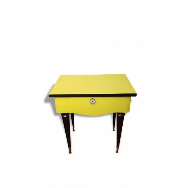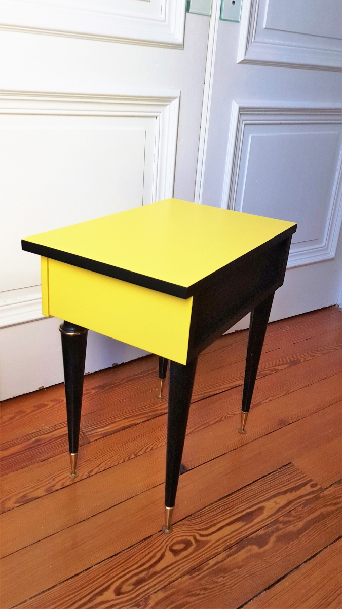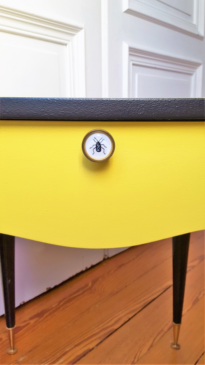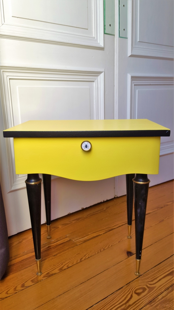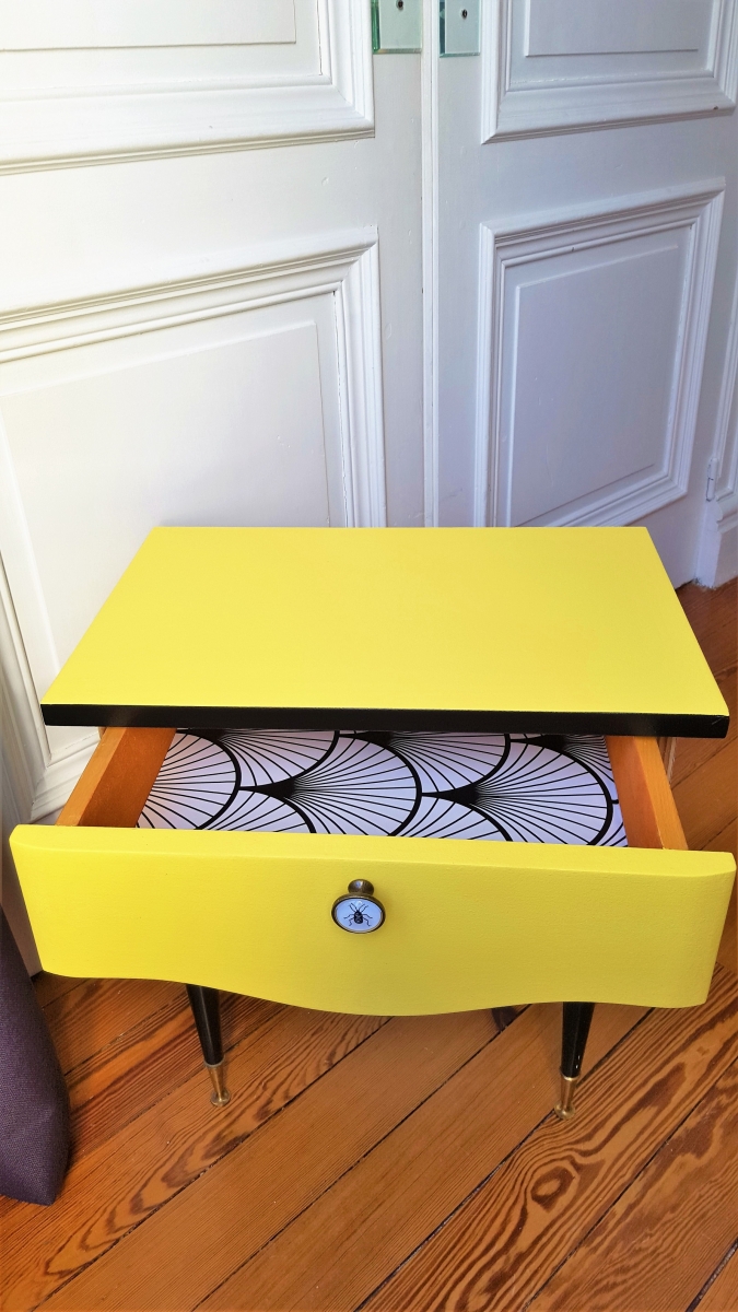 Joli chevet vintage des années 50 relooké en jaune et noir pour un look plus tendance. Sa poignée d'origine a été remplacée par un bouton "scarabée" pour un look "cabinet de curiosités" très tendance. L'intérieur du tiroir a été tapissé d'un papier peint très "art déco". Les pieds sont dans leur jus en bakélite noir.
