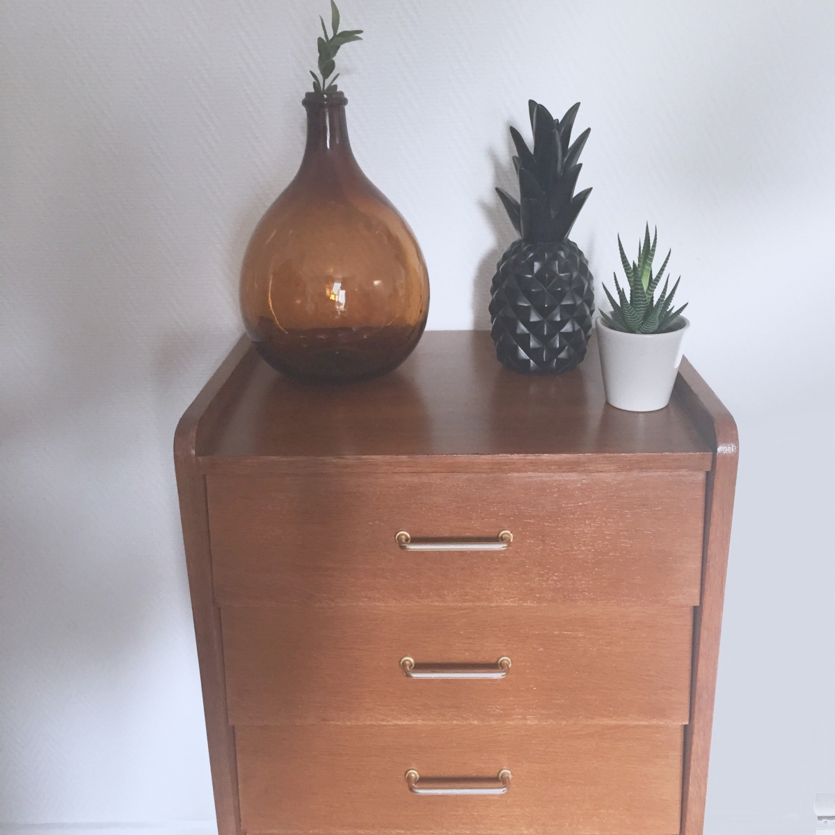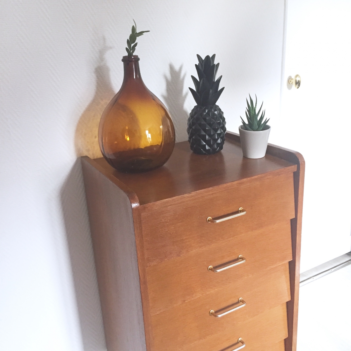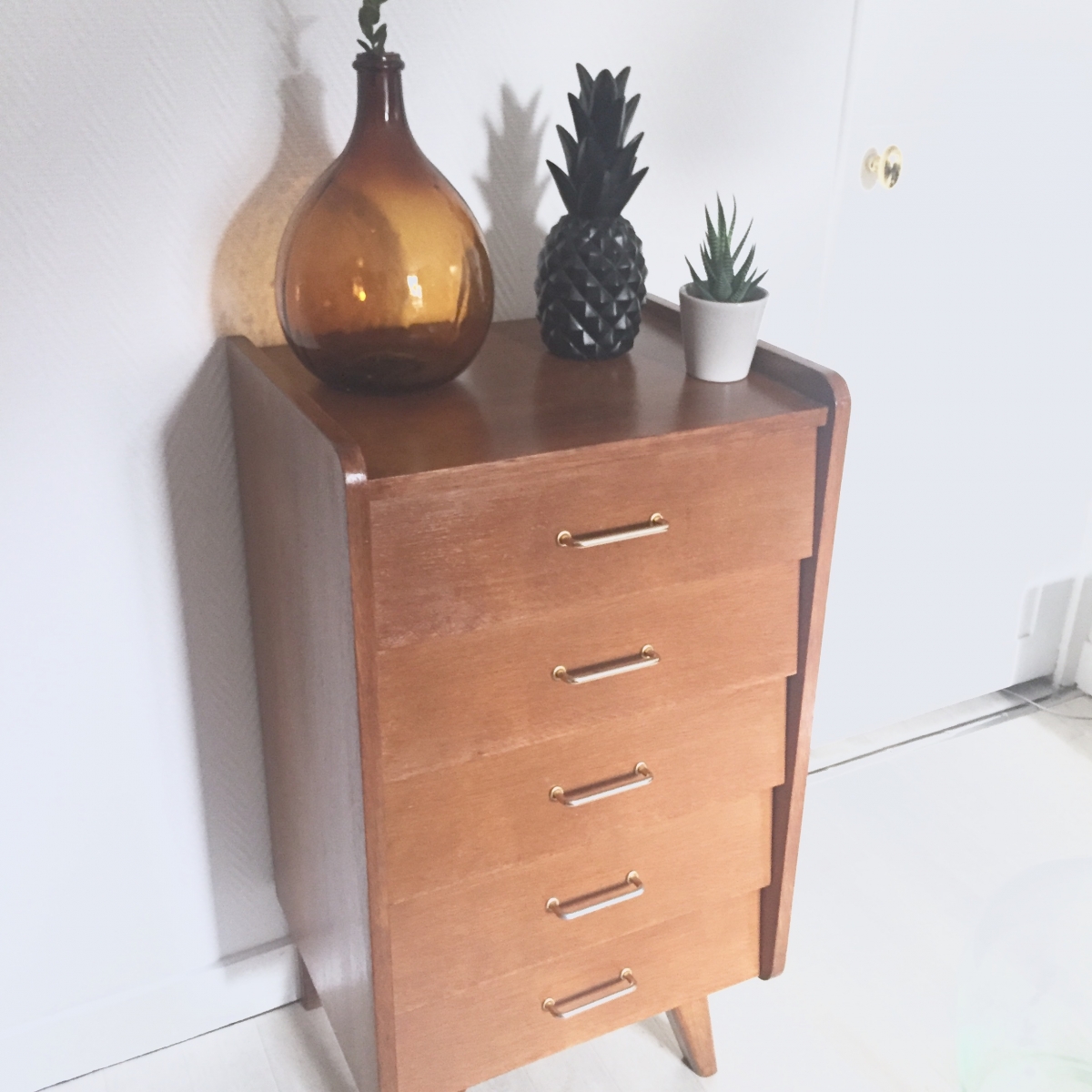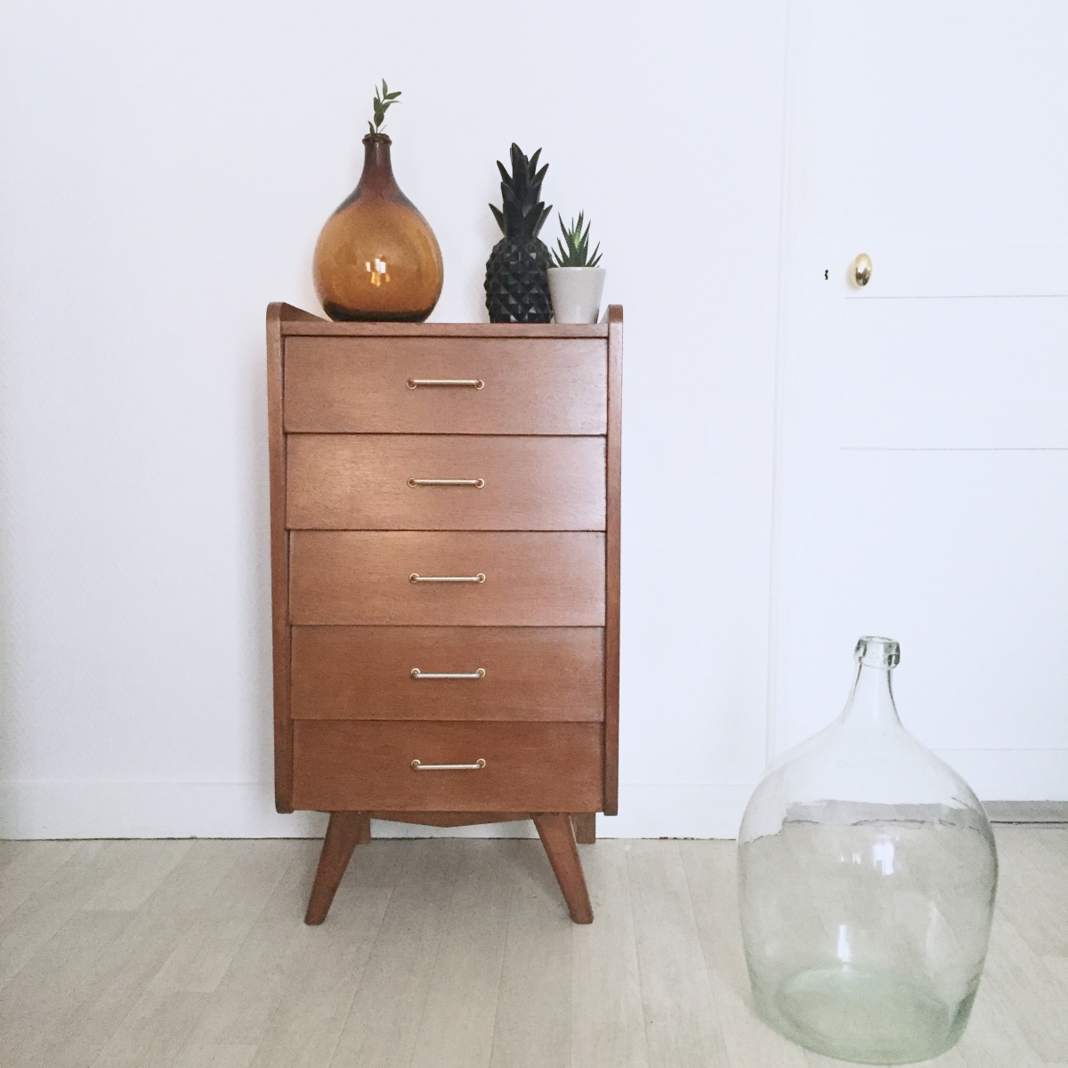 Magnifique chiffonnier en bois avec pieds compas et tiroirs inclinés modèle des années 60 en parfait état. Jolies poignées dorées. Livraison possible Paris île de France ou retrait melun, Corbeil Essonne.