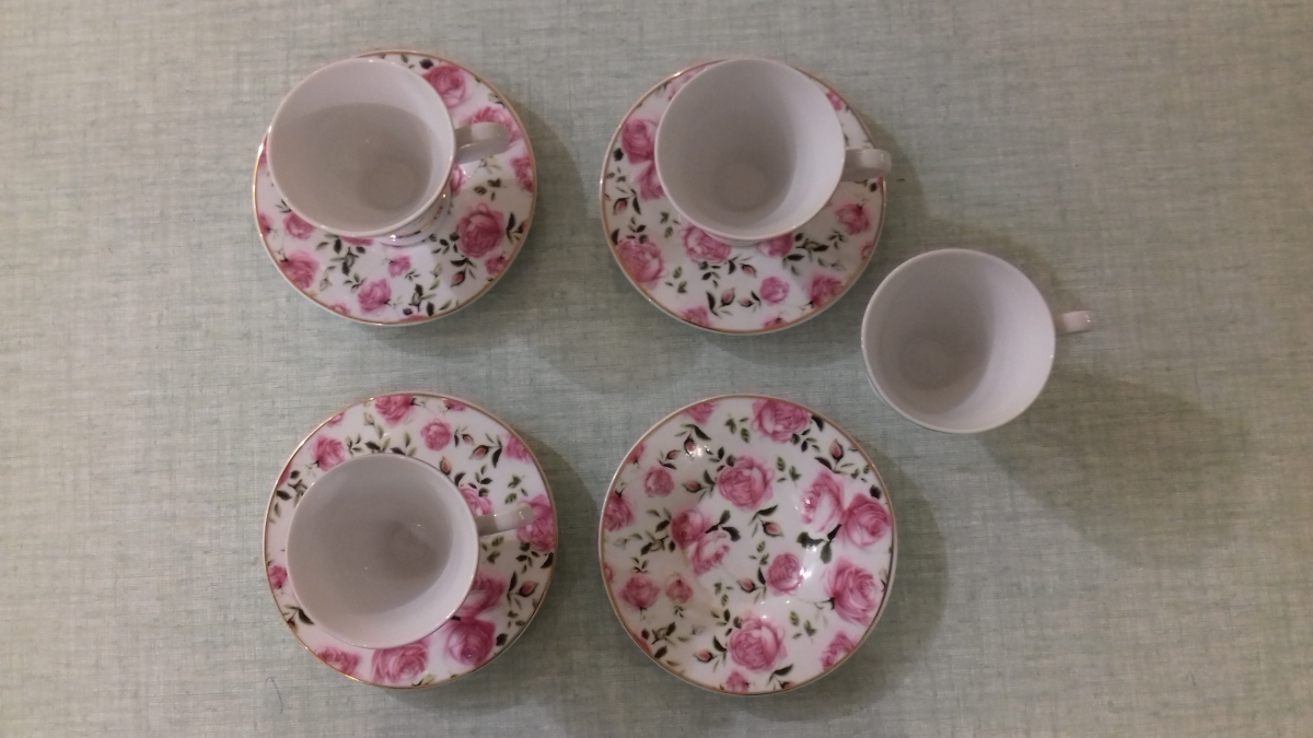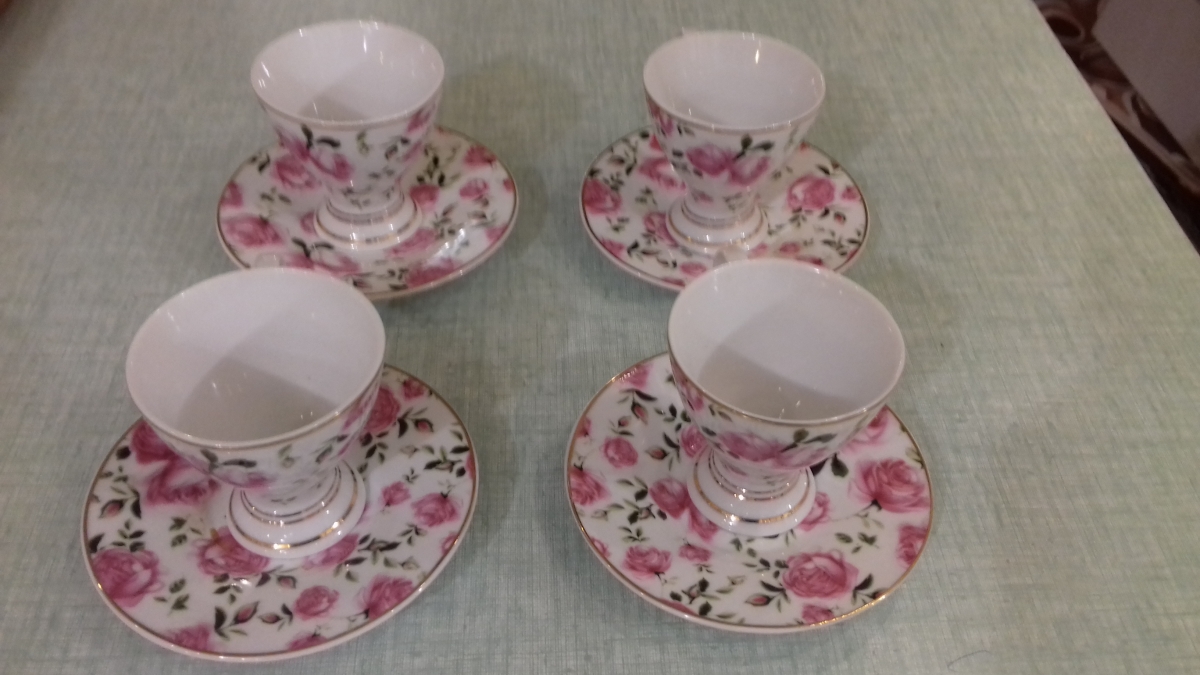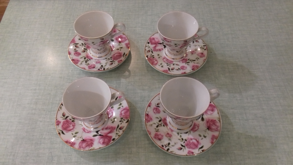 4 tasses à café motif floral rose et bordure dorée. Très bien conservées par le temps. Vintage et original.