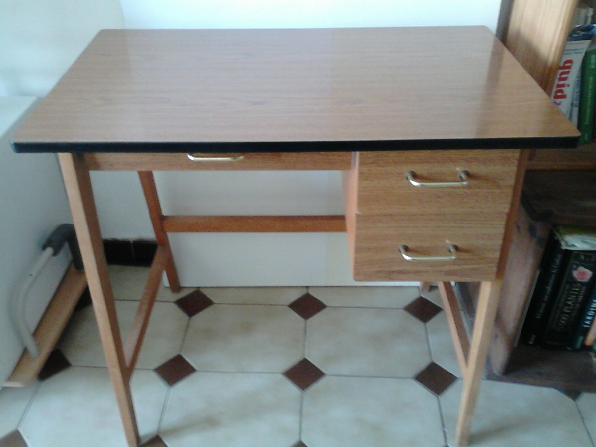 Bureau vintage année 60, style scandinave, pieds compas, plateau et façade tiroirs en formica imitation bois.