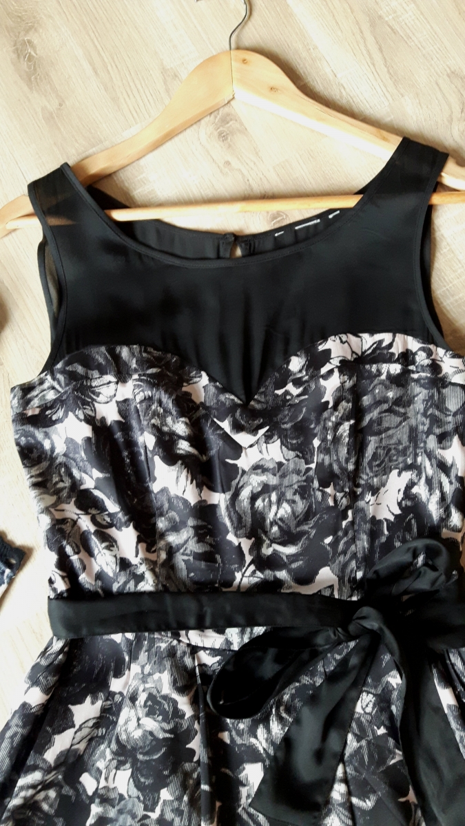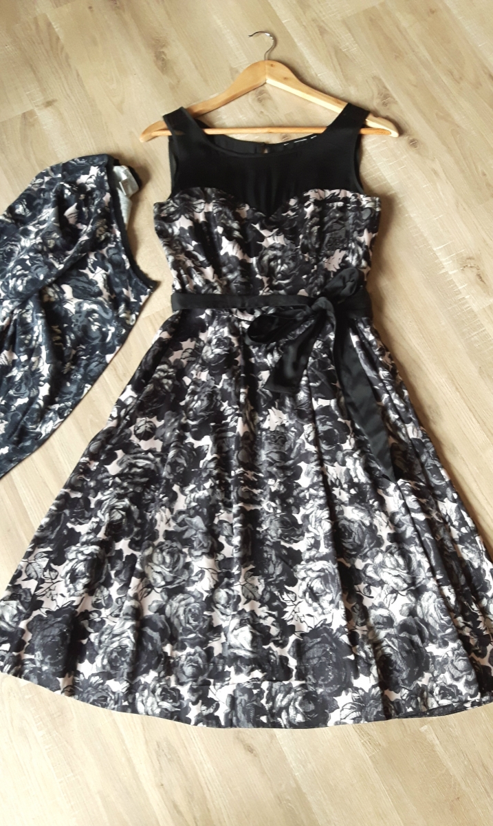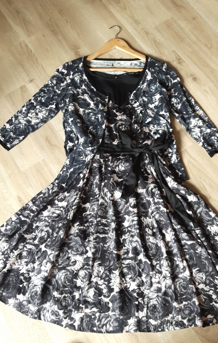 Adorable robe rétro sur fond rose nacré, sa ceinture "ruban" et son décolleté voilé lui donne un charme fou, le petit cardigan qui accompagne la robe a les manches trois quart bordées d'un petit feston noir, l'ensemble est très chic et vintage !