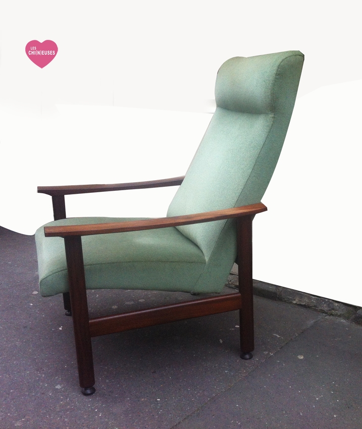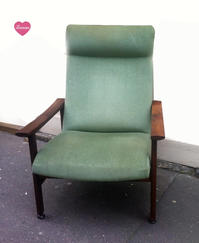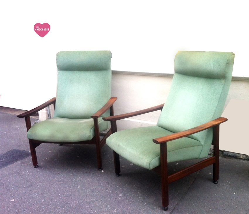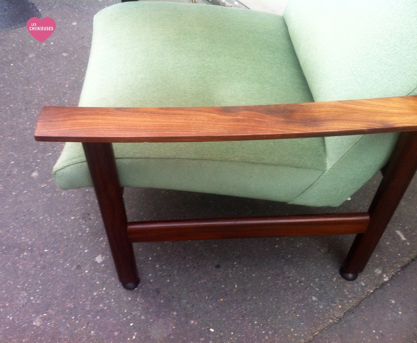 Paire de fauteuils design scandinave structure bois et revêtement velours vert amande. Excellent état de l'assise et du tissu. Le prix est pour la paire indissociable.