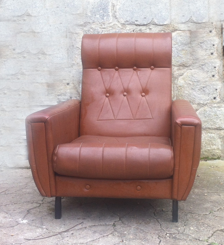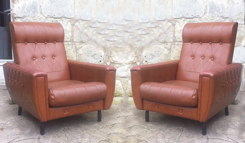 Paire de gros fauteuils en skaï marron clair avec surpiqûres et boutons.