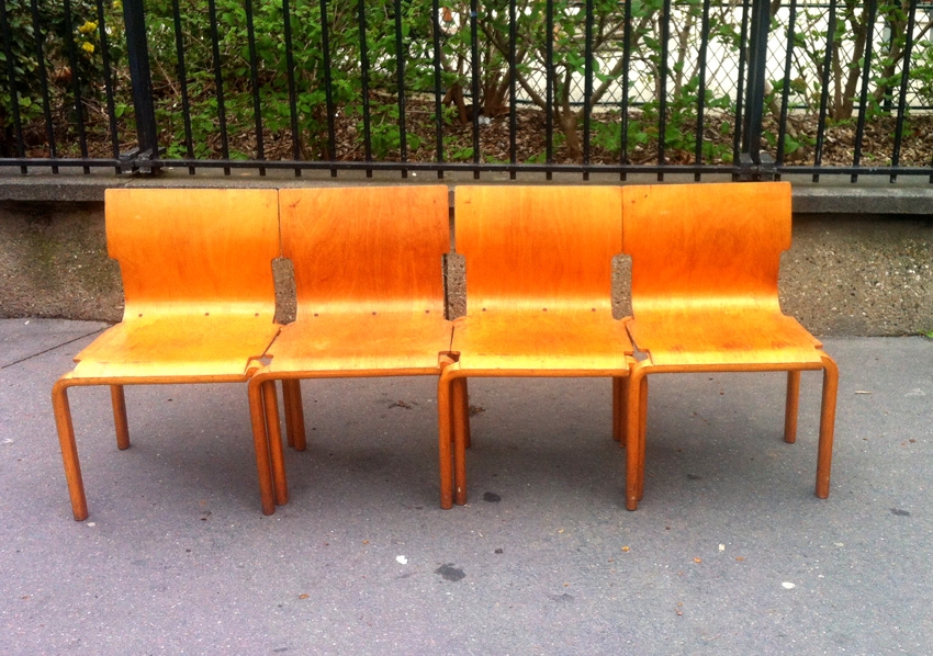 Elles ont la particularité de pouvoir s'accrocher entre elles au niveau du piètement pour former un banc de deux, ou trois places.