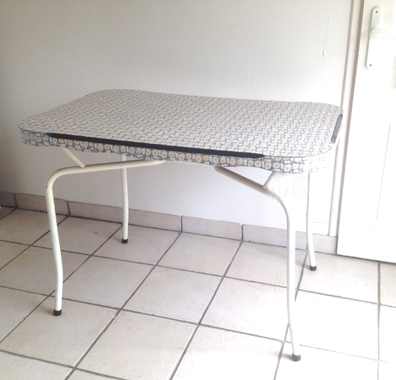 Très rare table en Formica fond blanc, imprimé bleu marine et jaune et piètement métal blanc - Made in England