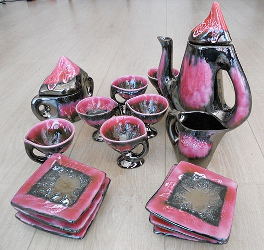 Service Vallauris en faïence à décor flammé rose et noir. Il se compose d'une verseuse, d'un sucrier couvert d'un pot à lait et de 6 tasses avec leurs sous tasses.